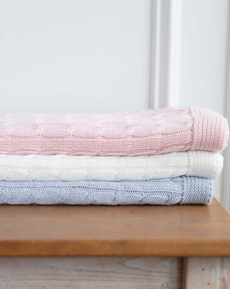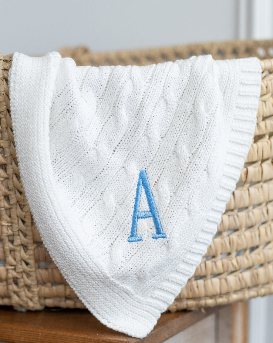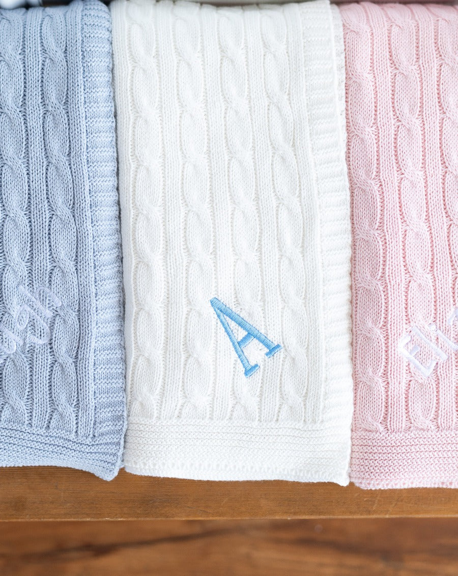 This beautiful and soft cable knit receiving blanket will be the perfect addition to your nursery. Also, makes a great gift for a newborn baby. Add a name or monogram for a personal touch.