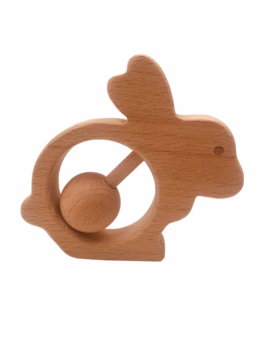 This natural wooden rattle is a classic toy for any baby. Also makes a great teether and baby gift! Choose between the classic, car, or bunny shapes.