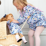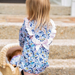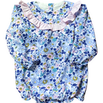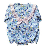 From her head to her toes she will look adorable in this blue floral bubble with a pink bow in back . This classic silhouette comes with a ruffle collar, long bishop sleeves with elastic in hem, and ruffles— Bubble comes with metal snaps in stride with ruffles on each leg hole.