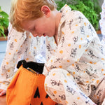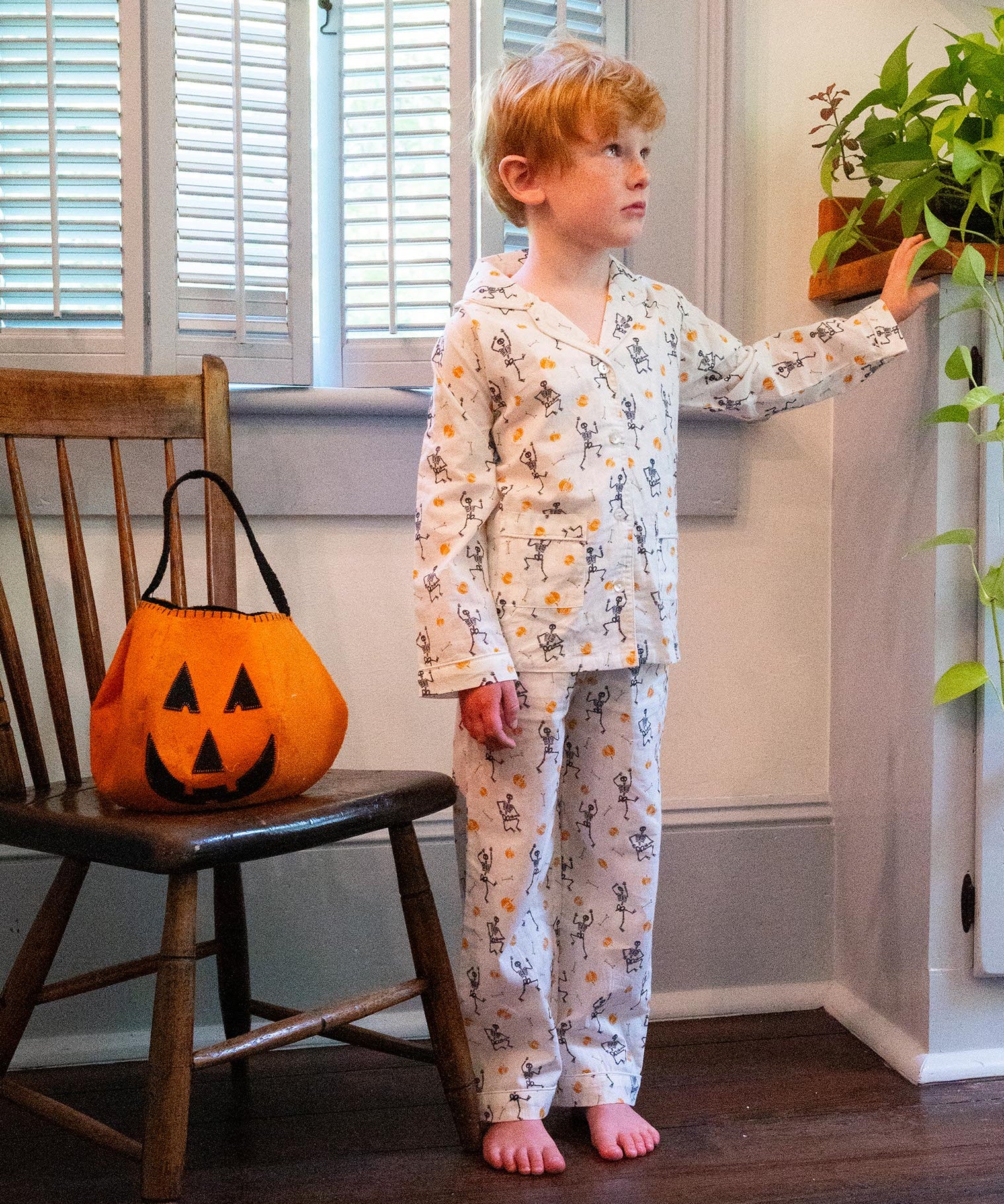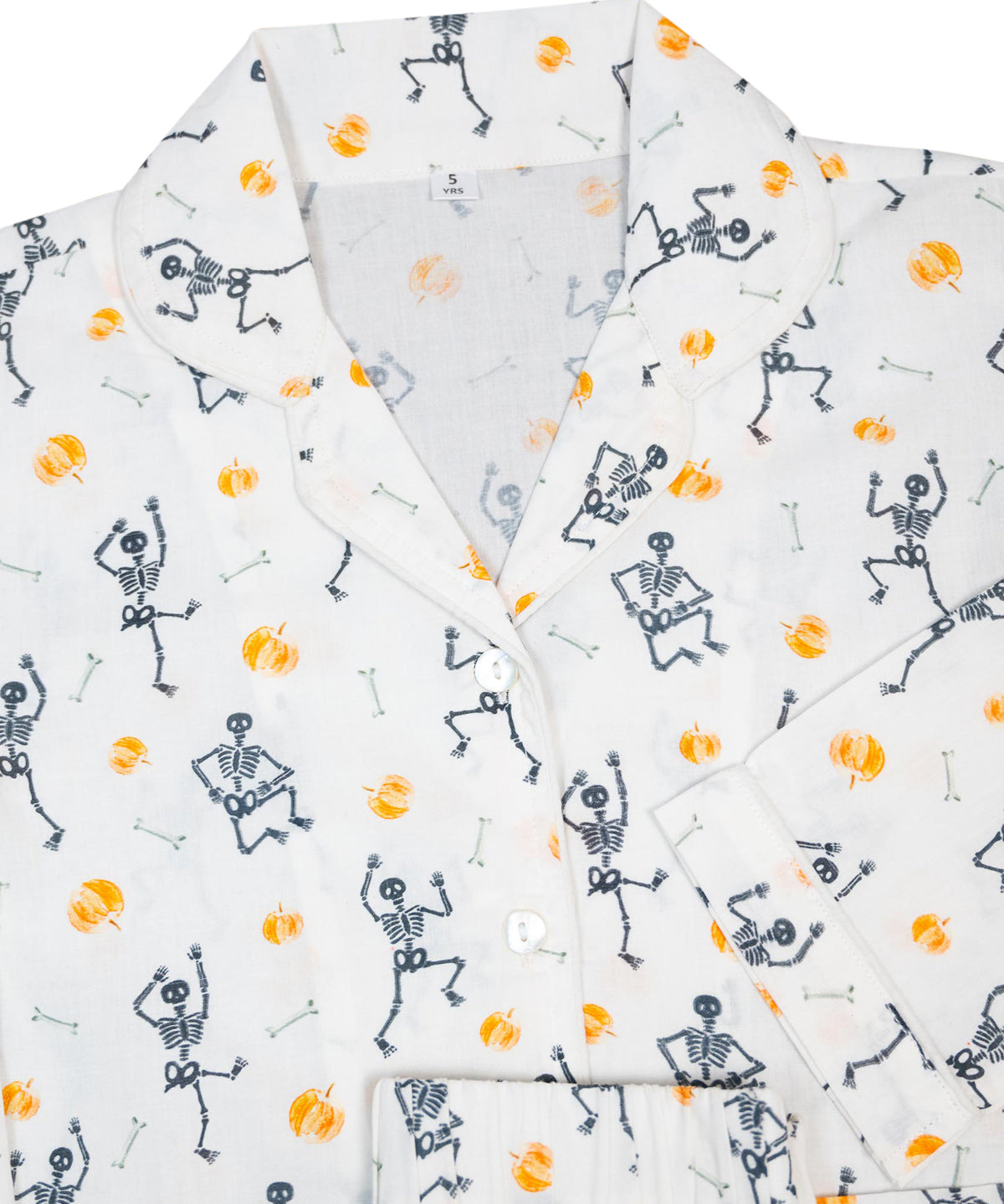 These Dancing Skeleton Button Down Pajamas are perfect for Halloween fun! Featuring playful skeletons, the pajama top includes pockets and buttons down the front, while the pants have an elastic waist for a comfortable fit. Available in adult sizes too, these Halloween pajamas are ideal for creating family memories and enjoying spooky fun together this Halloween season.