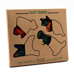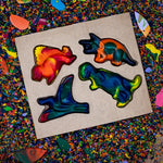 4 multi-colored Dinosaur crayons packaged in a plastic-free Kraft box, 5" x 6.5".