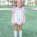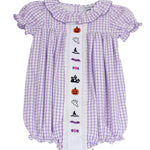We love this cute and festive outfit for Halloween! Our lavender gingham bubble features charming Halloween embroidery and a ruffle around the neck and sleeves. With metal snaps in the stride, this Halloween bubble is both adorable and practical. Grab this Halloween treat for your little one's wardrobe and make their spooky season extra special!