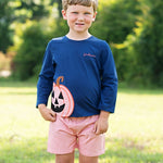 Pumpkin carving just got more fun with our festive Halloween Jack-o'-Lantern Applique Shorts Set. Perfect for Halloween, this set includes orange gingham shorts with an elastic waist and a long-sleeve navy knit top. The Halloween-themed Jack-o'-Lantern applique decorates the elbows and bottom of the shirt, adding a playful touch. Available in matching sibling sets with a coordinating trick-or-treat basket. Personalize it with a name or monogram for a special Halloween outfit!