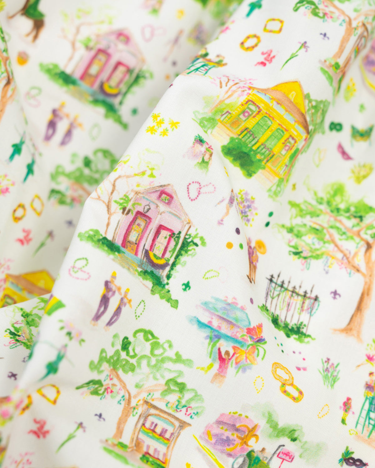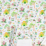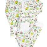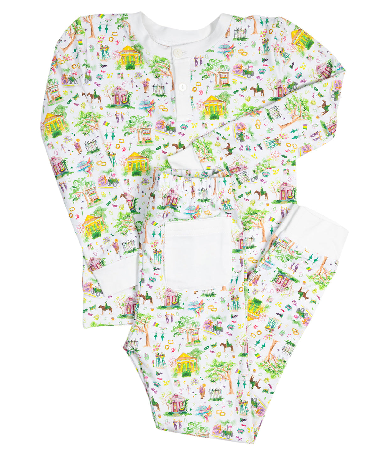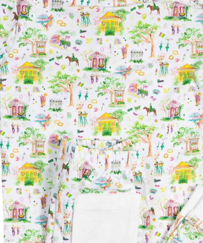 This Mardi Gras print pajama set features a print that depicts the scene of a Mardi Gras parade in New Orleans. This set has white trim around the neck, wrists and ankles. Snug fit and not sprayed with any chemicals. 55% cotton, 5% spandex.