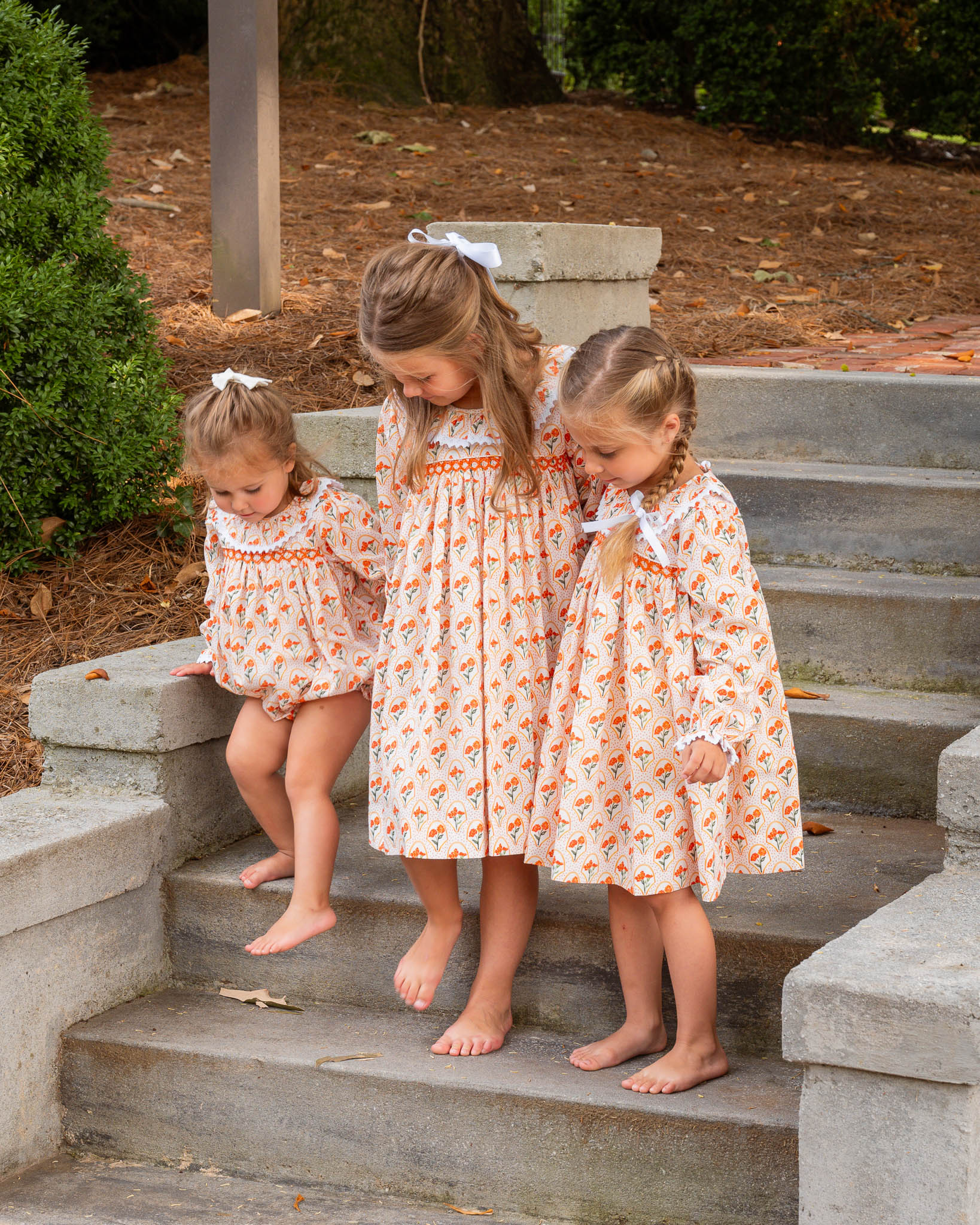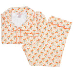 Enjoy a mommy and me matching fall pajamas in a colorful floral print. These pajamas feature a button down front with orange piping and elastic waist pants for a perfect fit.