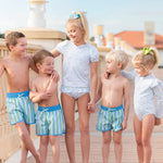 Finally Dad can match the children in these adult Blue and Green Striped Swim Trunks. This vintage style swimsuit features a drawstring waist and are fully lined for comfort.