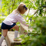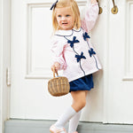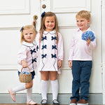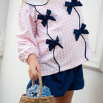 Take a stroll this fall in our Pink Gingham Knit Bloomer Set with Navy Bows. This style combines classic playfulness with the white knit rounded peter pan collar and long bishop sleeves. You will love the unique details of the six bows on the front of the top and matching navy bloomers that add a fun sweetness to a fall wardrobe. Add a name in vintage cursive to the collar for a personal touch.