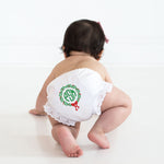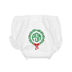 These classic white bloomers feature a delicate eyelet trim, topped with a customizable Christmas wreath monogram. Perfect to be worn under her favorite dresses, they add a touch of charm to your little girl’s winter wardrobe.