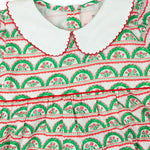 Delight in the festive charm of our Scalloped Holiday Floral Dress! Designed with a whimsical scalloped holiday floral print, this dress features a crisp white peter pan collar, delicate red piping, and charming puff sleeves. The statement red sash adds the perfect finishing touch, making this dress a must-have for holiday celebrations, family photos, and special gatherings.