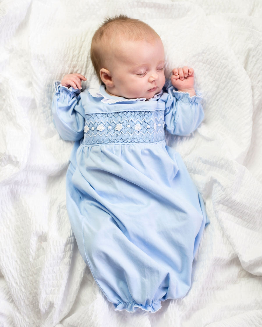 Smocked Baby Gown For Girl in Pale Blue Knit