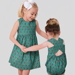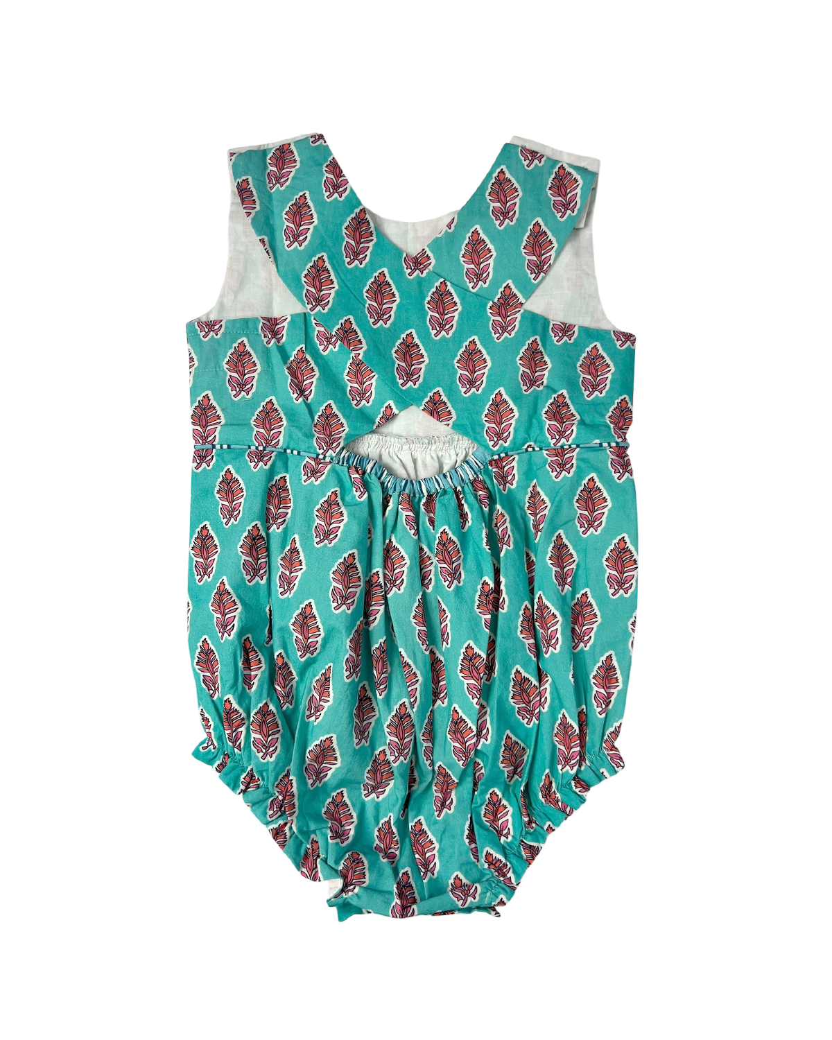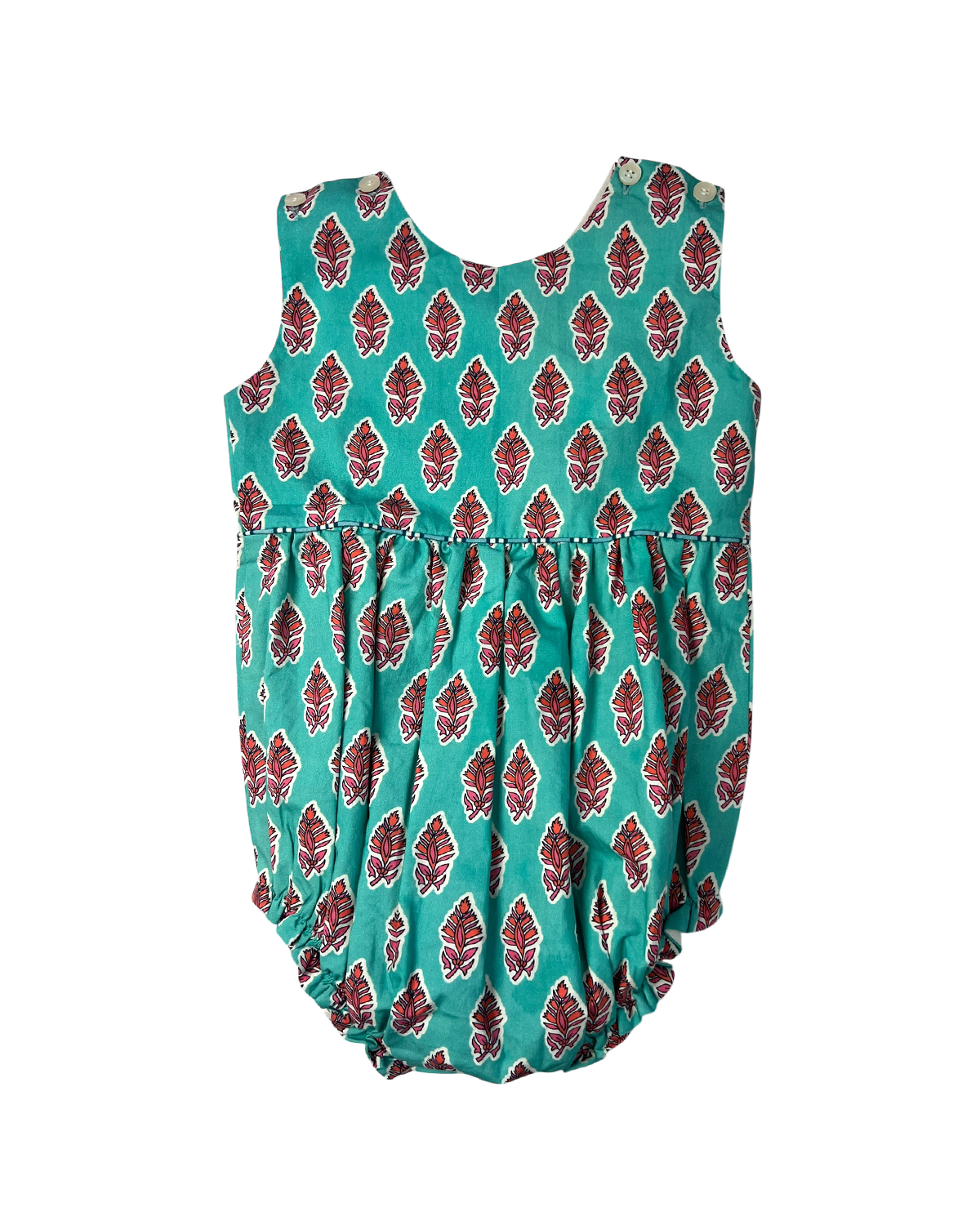 This sweet bubble showcases a graceful blushing leaves block print for a timeless look. Designed for comfort and easy movement, it is made of lined cotton and has adjustable button straps. It’s ideal for playtime and special outings. The soft floral pattern and criss cross open back adds gentle charm. A lovely staple for any season.