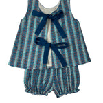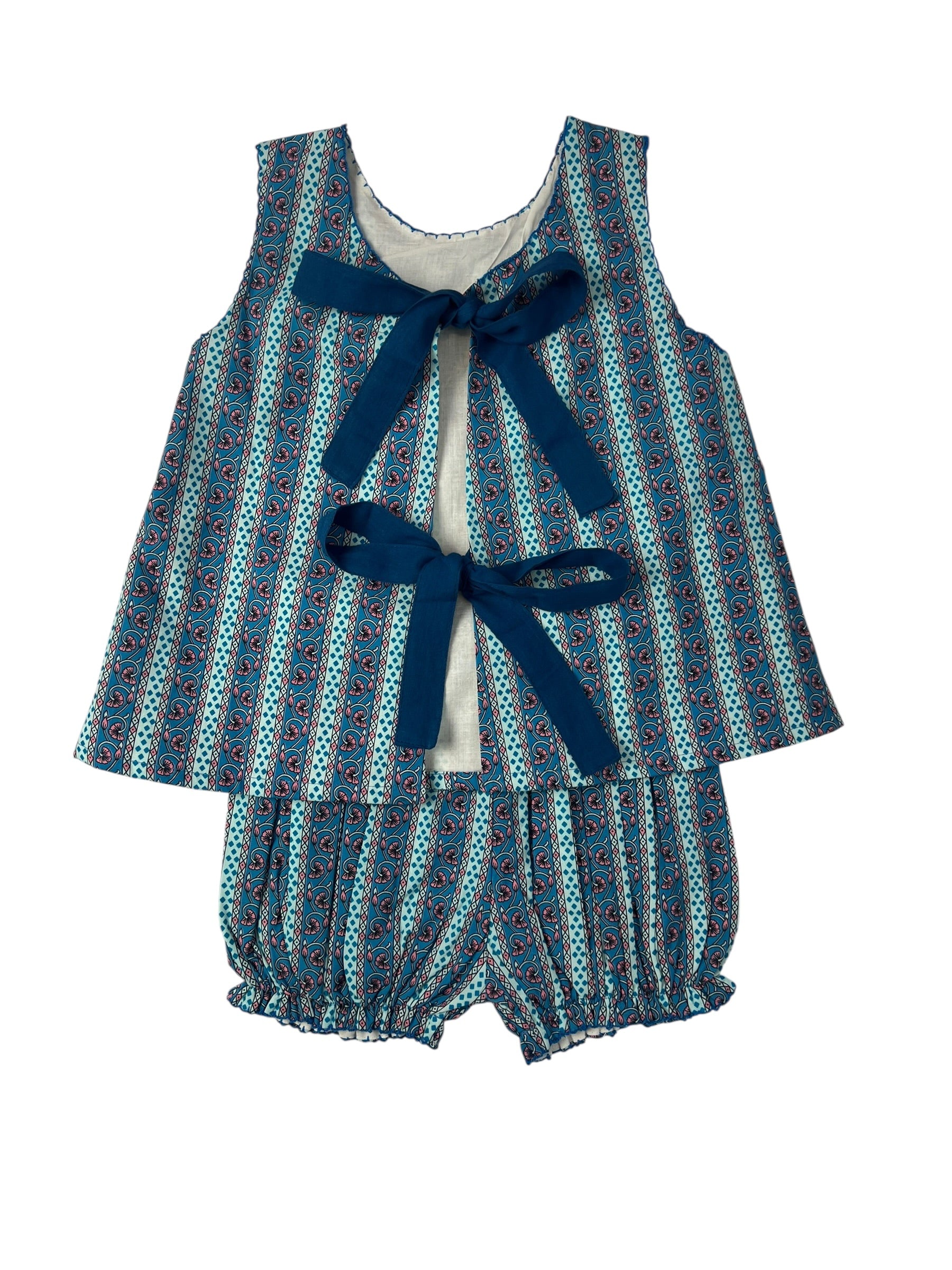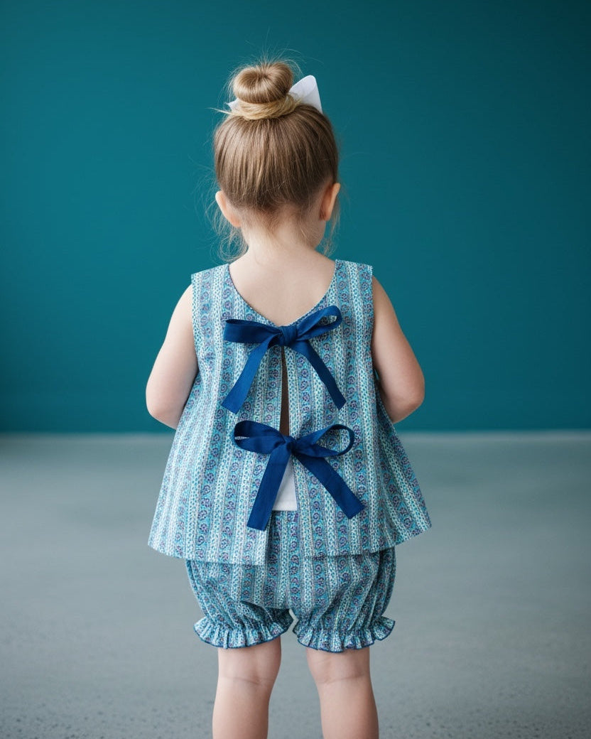 This beautiful and bold bloomer set highlights a rich sapphire swirl block print. Designed for comfort with lined cotton, and coordinated style with a matching dress for big sister, it’s perfect for warm-weather days. The detailed picot trim adds a refined touch and the adjustable ties and elastic waistband are for the perfect fit. A charming and versatile favorite.