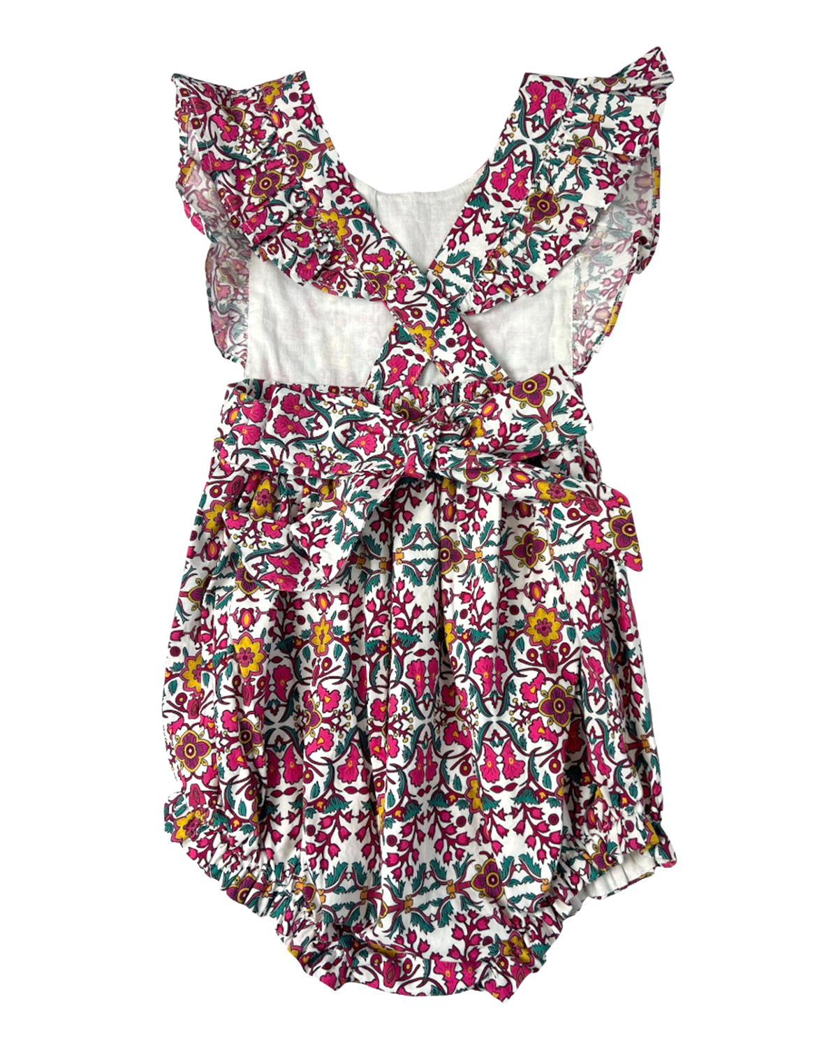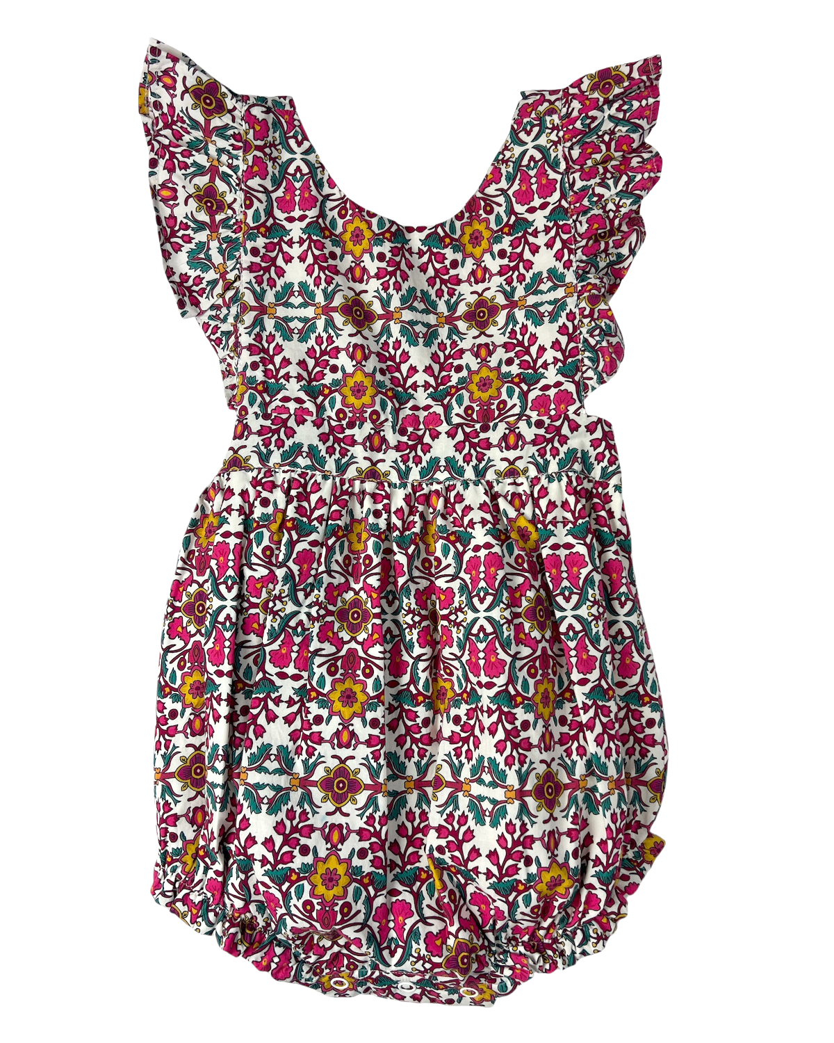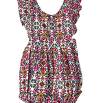 This adorable bubble highlights a colorful tutti frutti floral block print. This cotton bubble features criss cross straps in the back with adjustable buttons and a tie in the back for the perfect fit for comfort and all-day wear, it’s perfect for sunny adventures. The fun pattern adds a cheerful touch. A sweet favorite for little ones.