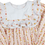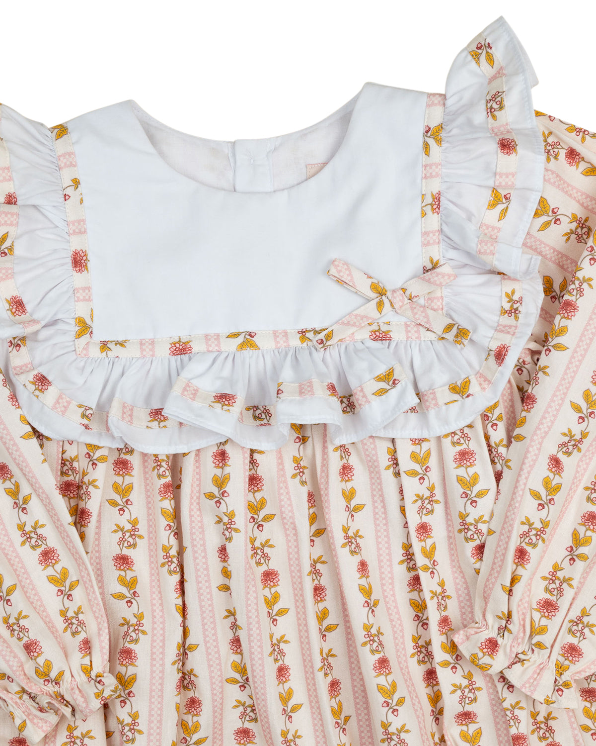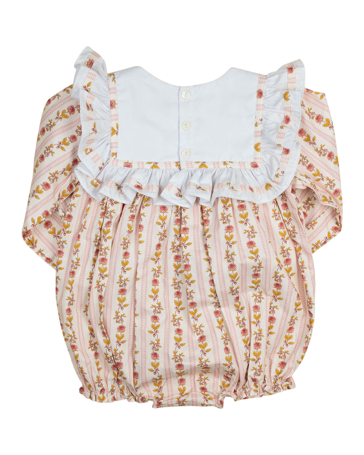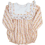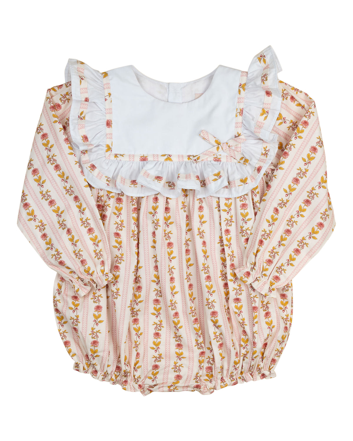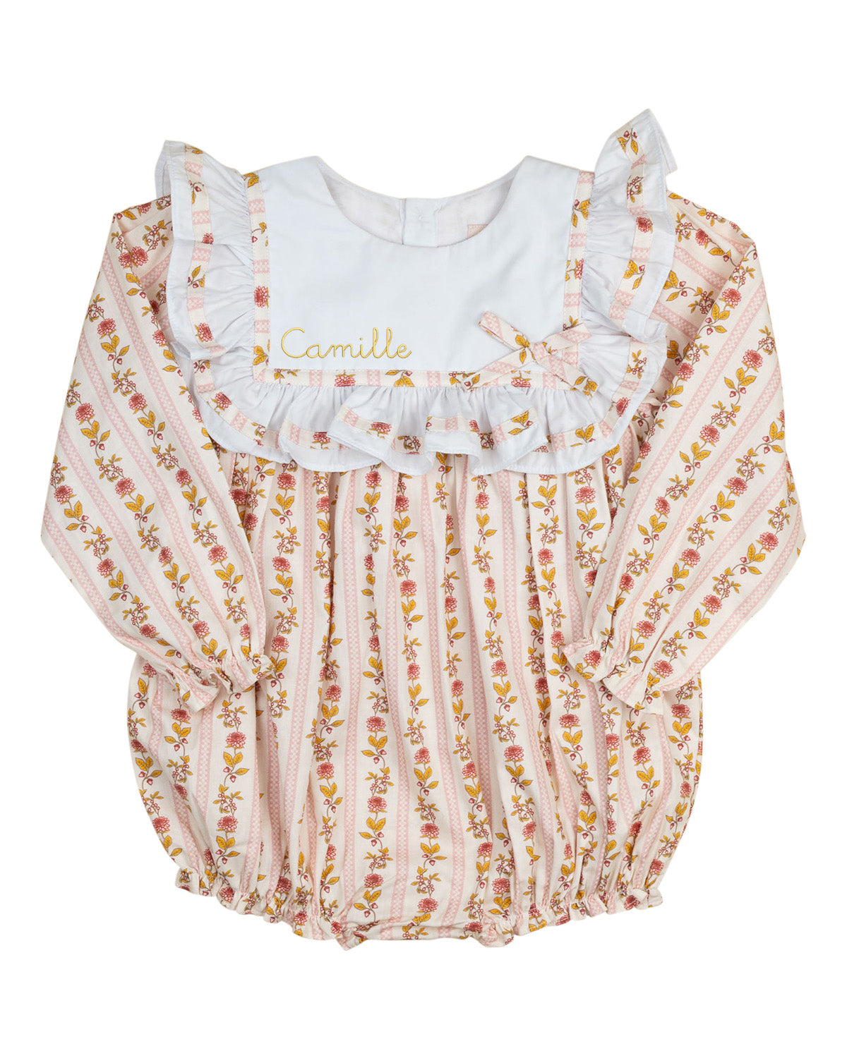 Fall fun is sure to blossom in this classic style bubble. This bubble features a fall floral print throughout, and a ruffle bib collar with bow. You can add a name to the collar for a personal touch. Snaps in the stride for easy changing.