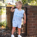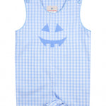 This Jack-O-Lantern Applique Gingham Shortall is a must-have for your little guy’s spooky season wardrobe! Made from classic blue gingham with a cheerful pumpkin face appliqué, this one-piece is great for Halloween fun and fall outings. Personalize it with his name for extra charm.