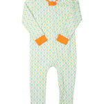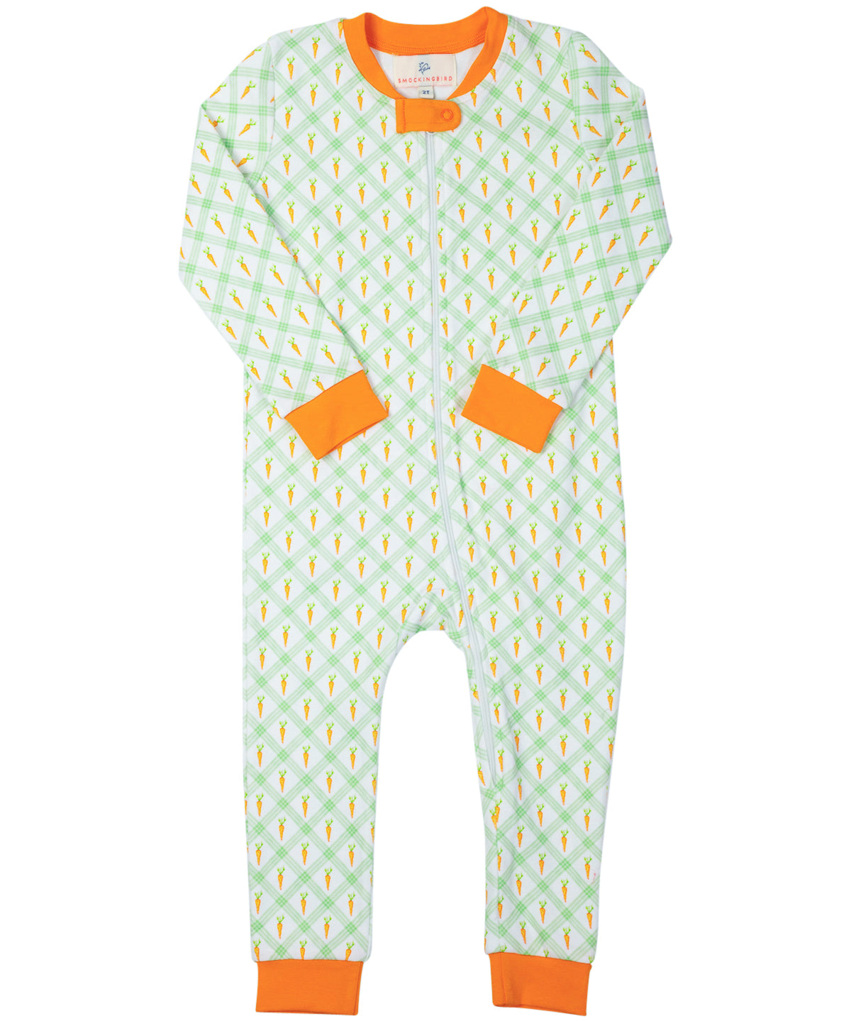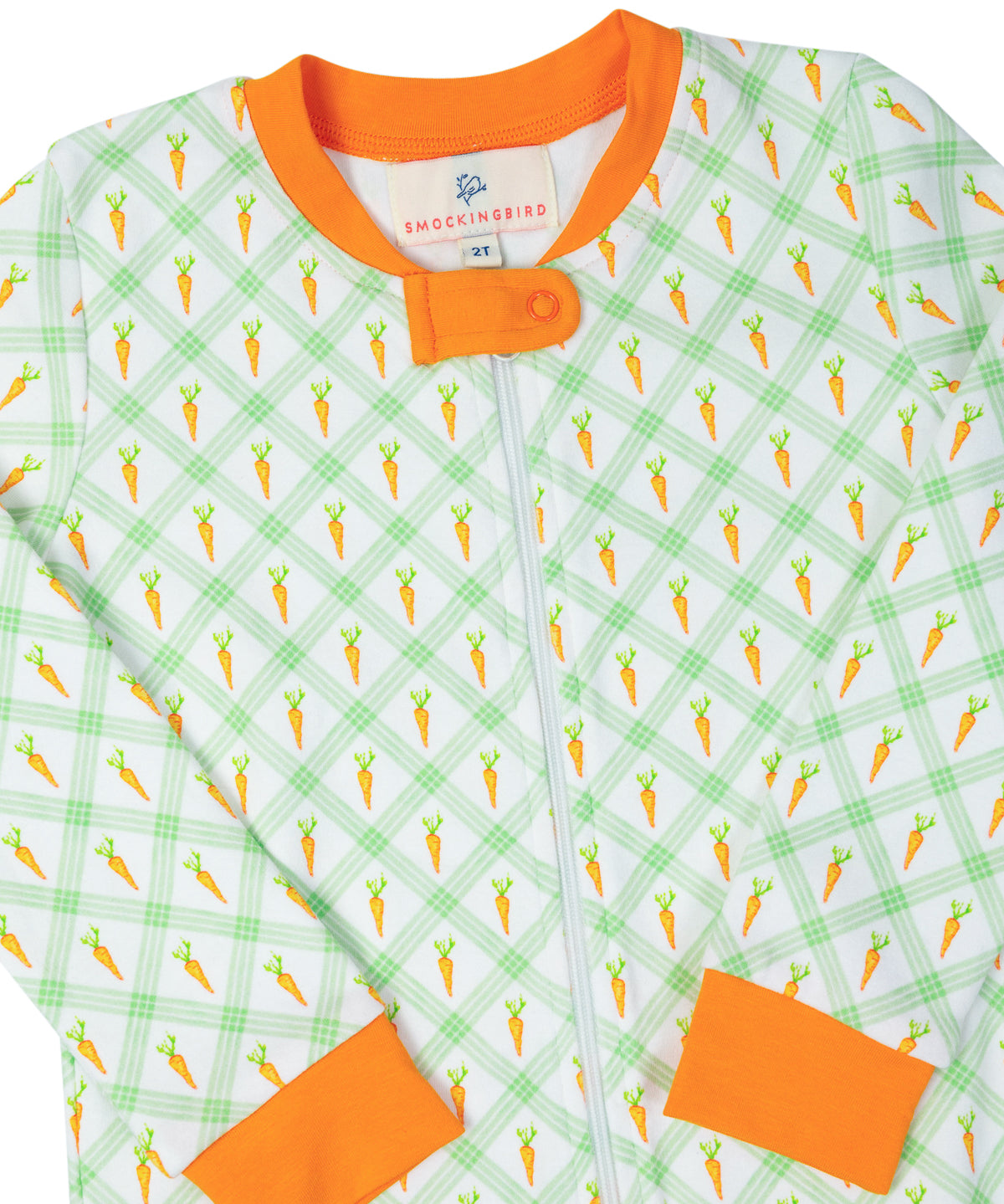Be HOPPY in these ultra soft pajamas perfect for spring. These Carrot Crush Pajamas feature a darling orange and green carrot print with orange trim around the neck, wrists, and ankles. Perfect for Easter and Spring nights. Add a monogram to the seat for a personal touch.