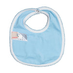 This blue bib features geometric smocking across the center and adjustable snaps in the back. Add a name in small vintage cursive font under the smocking for a personal touch.