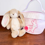 Little Nibble the Floppy Bunny features signature handcrafted details throughout. 12” (30cm) tall, measured from head to outstretched toe. Safe for all ages, 100% polyester. This stuffed animal is surface clean only. Available to by personalized with a name on the ear