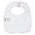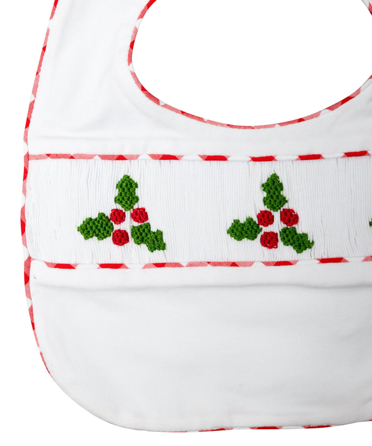 White bib trimmed in red gingham with smocked Christmas holly berries. A sweet bib for baby's first Christmas. Adjustable snaps.
