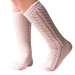 These beautiful open-work socks by Carlomagno are made from Scottish yarn. Offered in white or light pink.