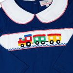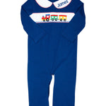 Such a darling longall for fall and winter. This Train Smocked Knit Longall is sure to be a favorite with the hand smocked trains across the chest and white peter pan collar perfect for personalization. This longall has snaps in the stride for easy changing.