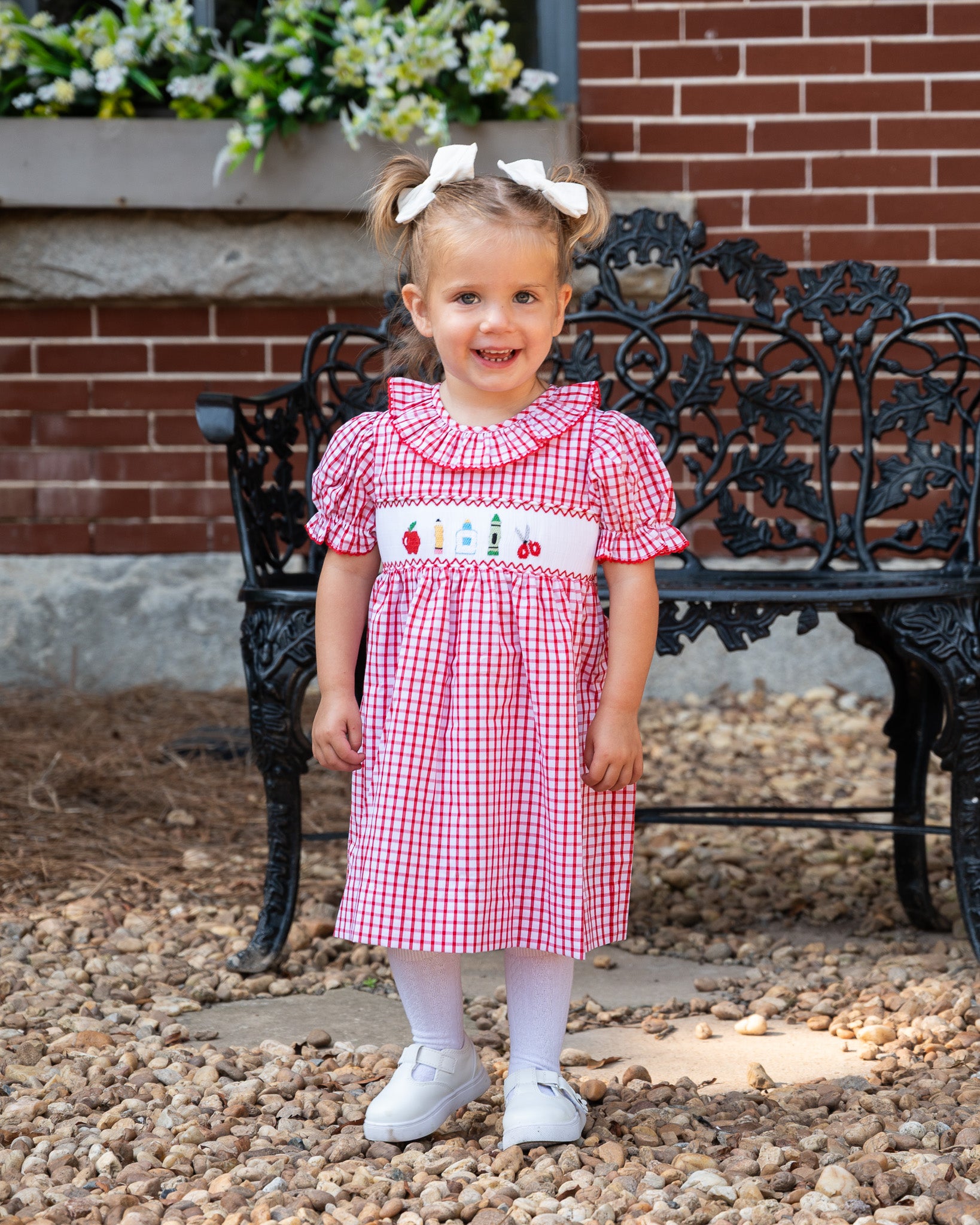 Step into your new classroom in style this fall. This dress features hand smocked school supplies across the chest, short puff sleeves and a ruffle collar. Red windowpane fabric, and mother of pearl buttons down the back.