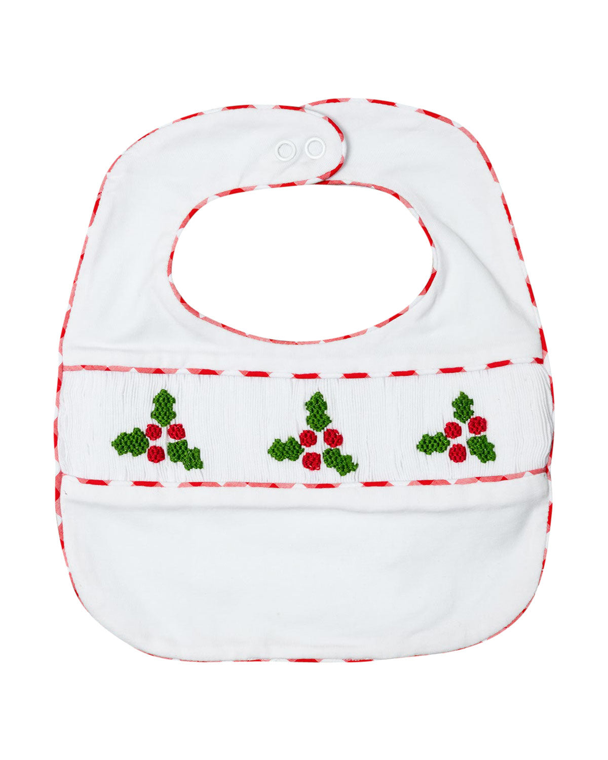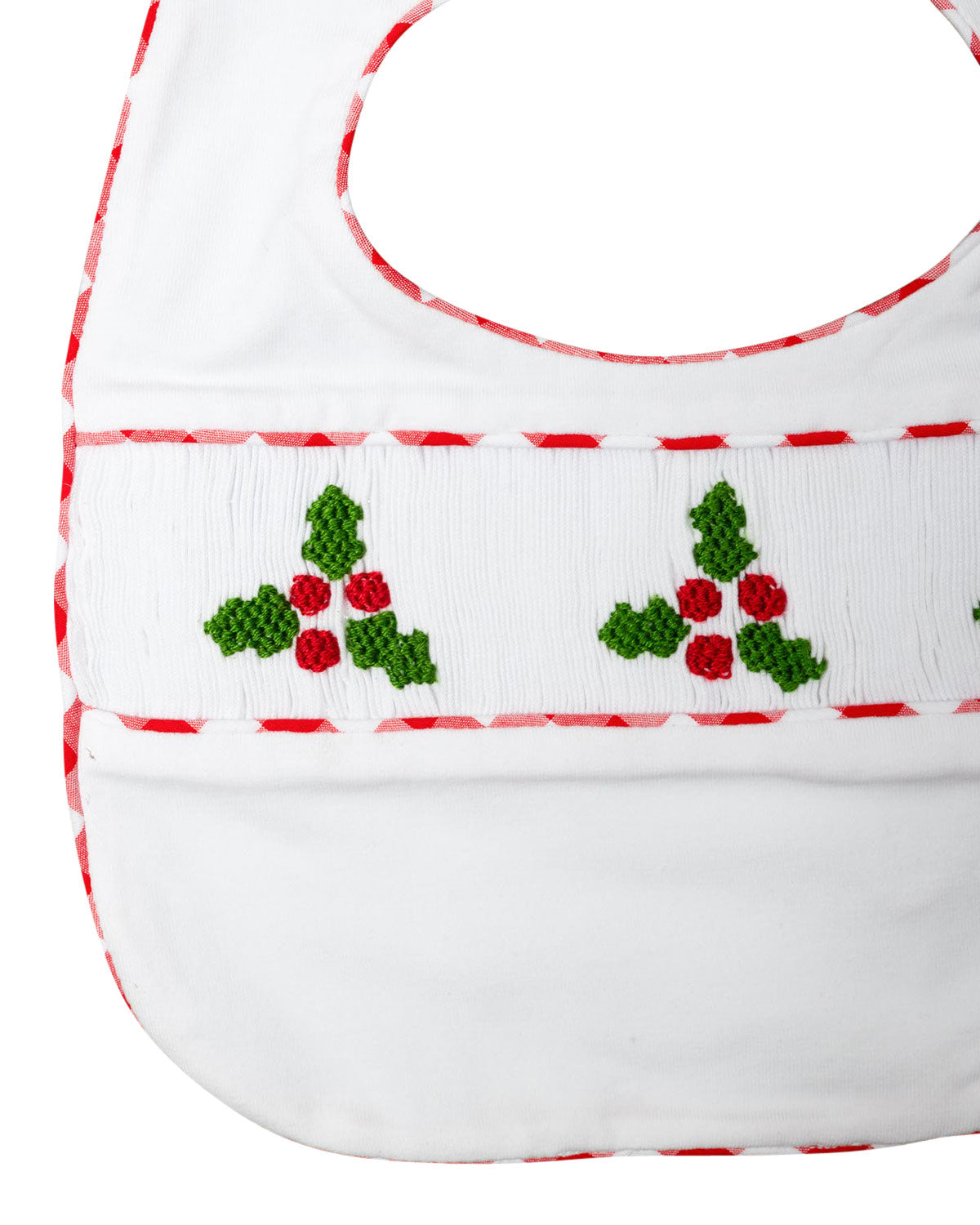 White bib trimmed in red gingham with smocked Christmas holly berries. A sweet bib for baby's first Christmas. Adjustable snaps.