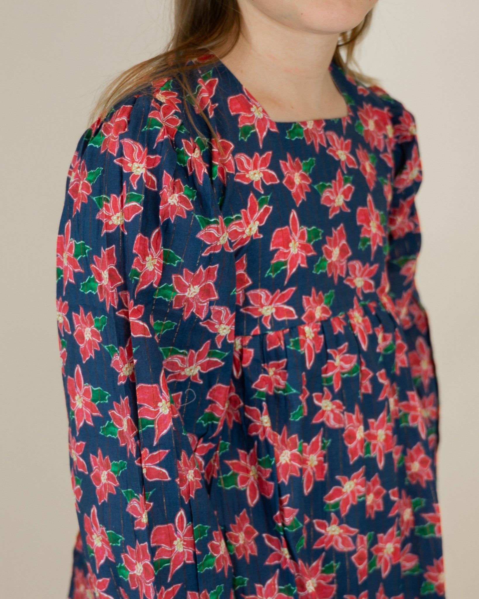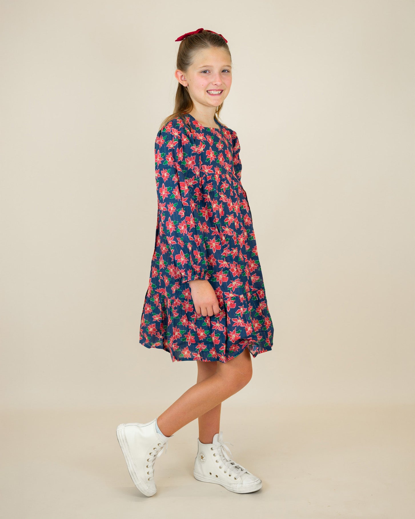 Make holiday memories shine with our Poinsettia With Gold Lurex Dress! Featuring a stunning poinsettia print accented with shimmering gold lurex stripes, this festive dress is designed for elegance and comfort. Long sleeves, a gathered waist, and a ruffled hem create a charming silhouette, making it perfect for Christmas celebrations, family gatherings, and holiday photos.