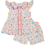 Stay cool and stylish with the ABC Short Set! This ruffle-sleeve top and matching shorts combo features a fun, colorful alphabet design, perfect for warm days and endless adventures. Whether it's a playdate or a casual outing, this set is a go-to favorite. And bonus, we love anything with pockets!