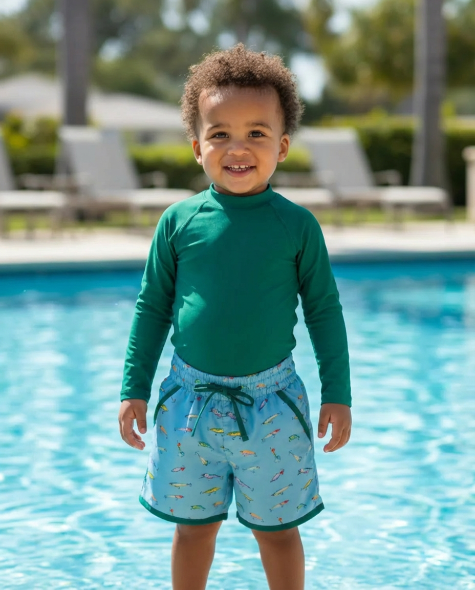These swim trunks feature a playful fishing-inspired print for fun days by the water. Designed for comfort and easy movement, they’re perfect for pool and beach adventures. The cheerful design adds personality. A summer essential for active little ones.