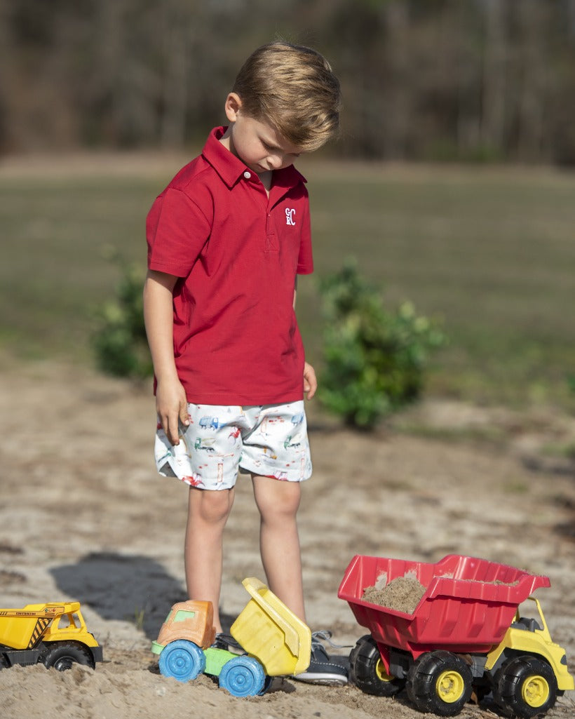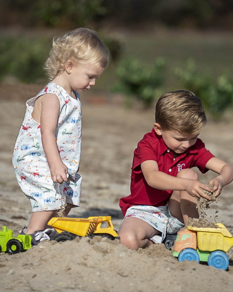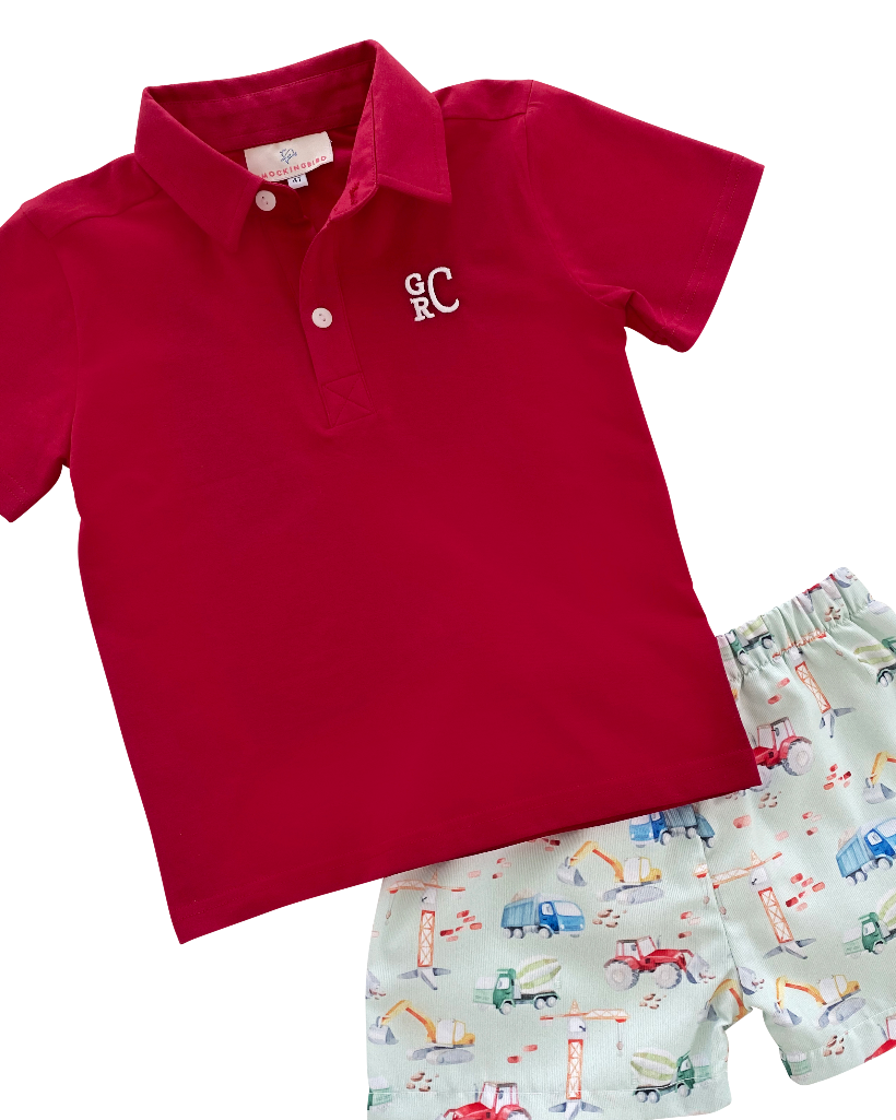Caution, he will dig this construction truck shorts set that is perfect for playing in the sandbox. Monogram shown in stacked font with white thread.