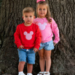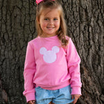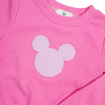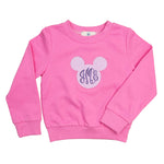Style meets comfort in this Main Street Applique Mouse Sweatshirt in Pink. Perfect for a play date with friends or a trip to Disney. Personalize your sweatshirt with a monogram or a name. Fits true to size, size up for an oversized fit.
