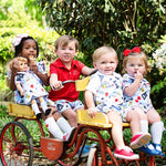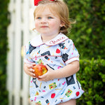 School is back in session and we have all your favorite school supplies on this adorable bubble. Bubble features custom school supplies print with a large rounded peter pan collar, red gingham piping, and short puff sleeves. Buttons in the back with mother of pearl buttons. The bubble is fully lined and has metal snaps in stride for easy changing. Monogram show in vintage cursive font with red thread.