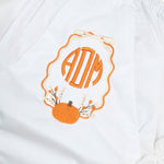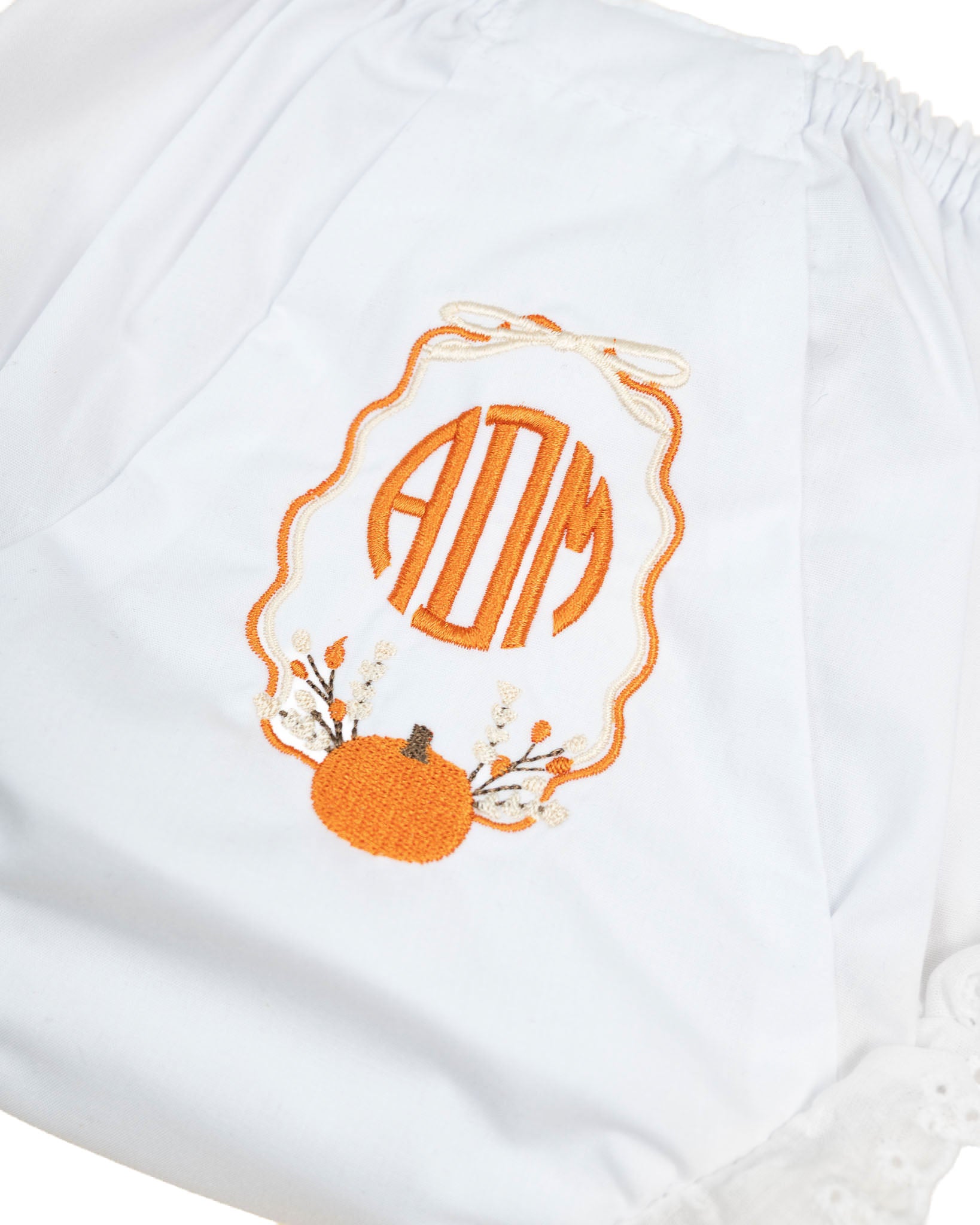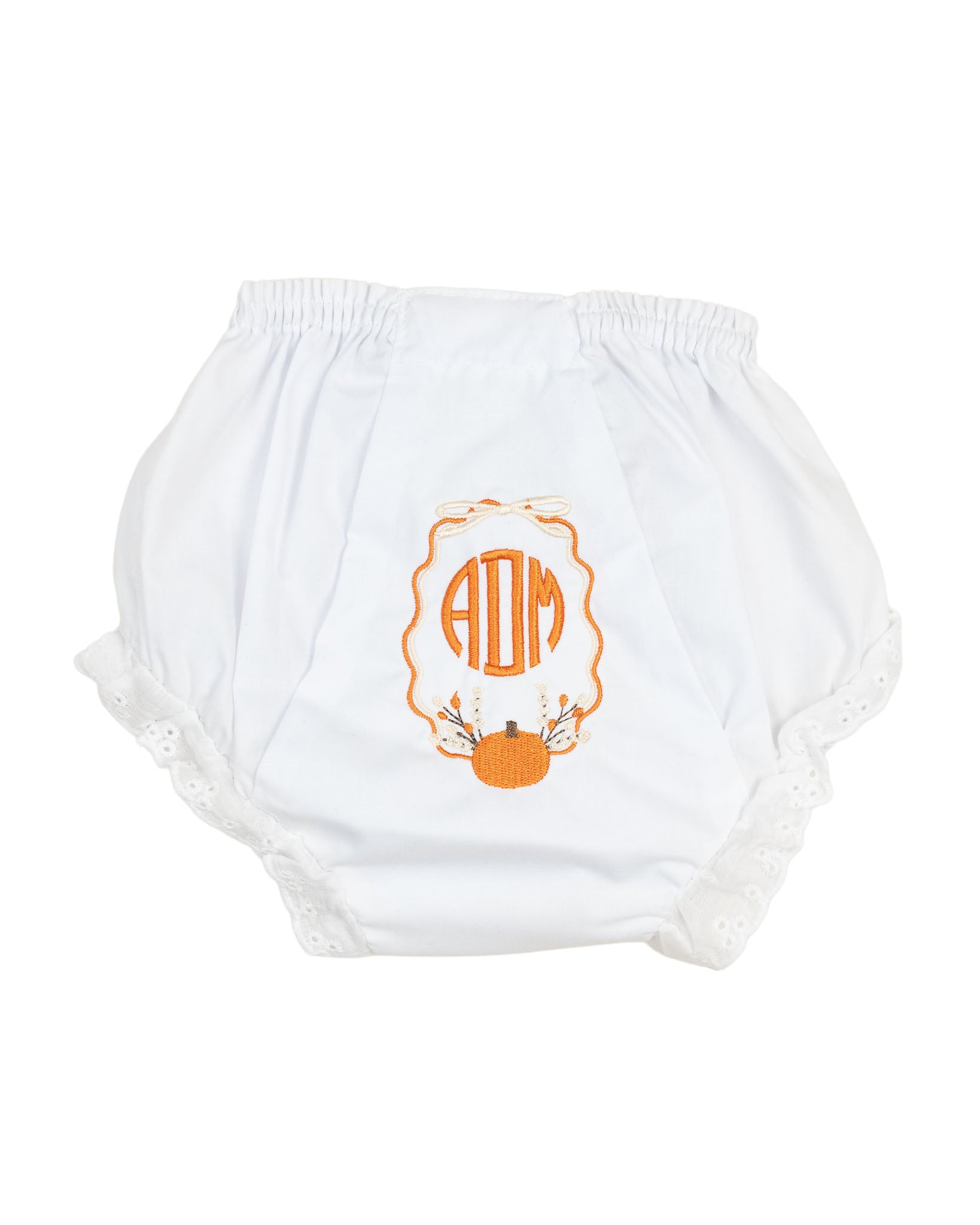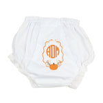 Say hello to the cutest fall layer ever! These classic white bloomers feature a delicate eyelet trim, topped with a customizable fall wreath monogram. Perfect to be worn under her favorite fall dresses, they add a touch of charm to your little girl’s fall wardrobe.