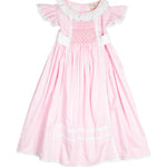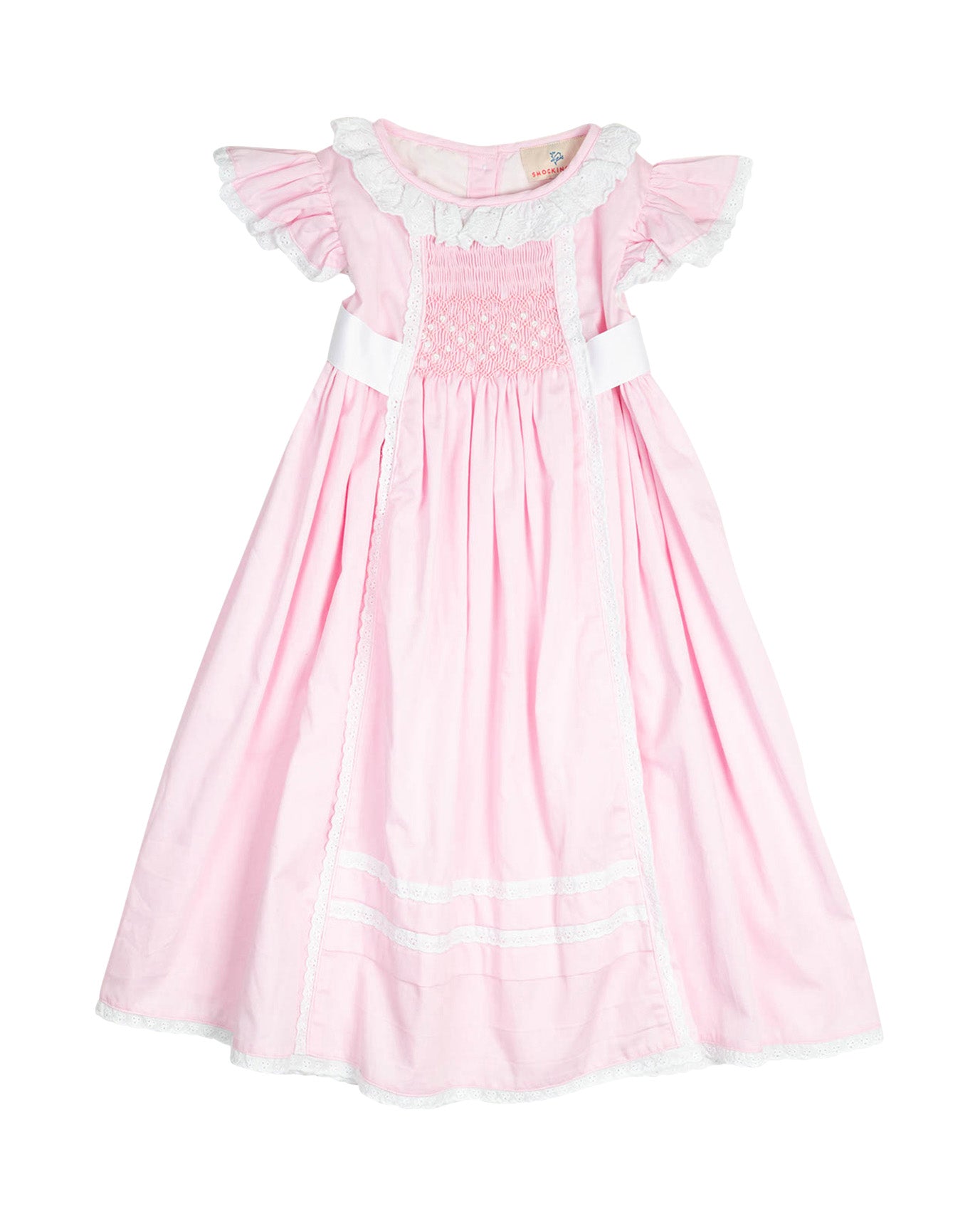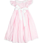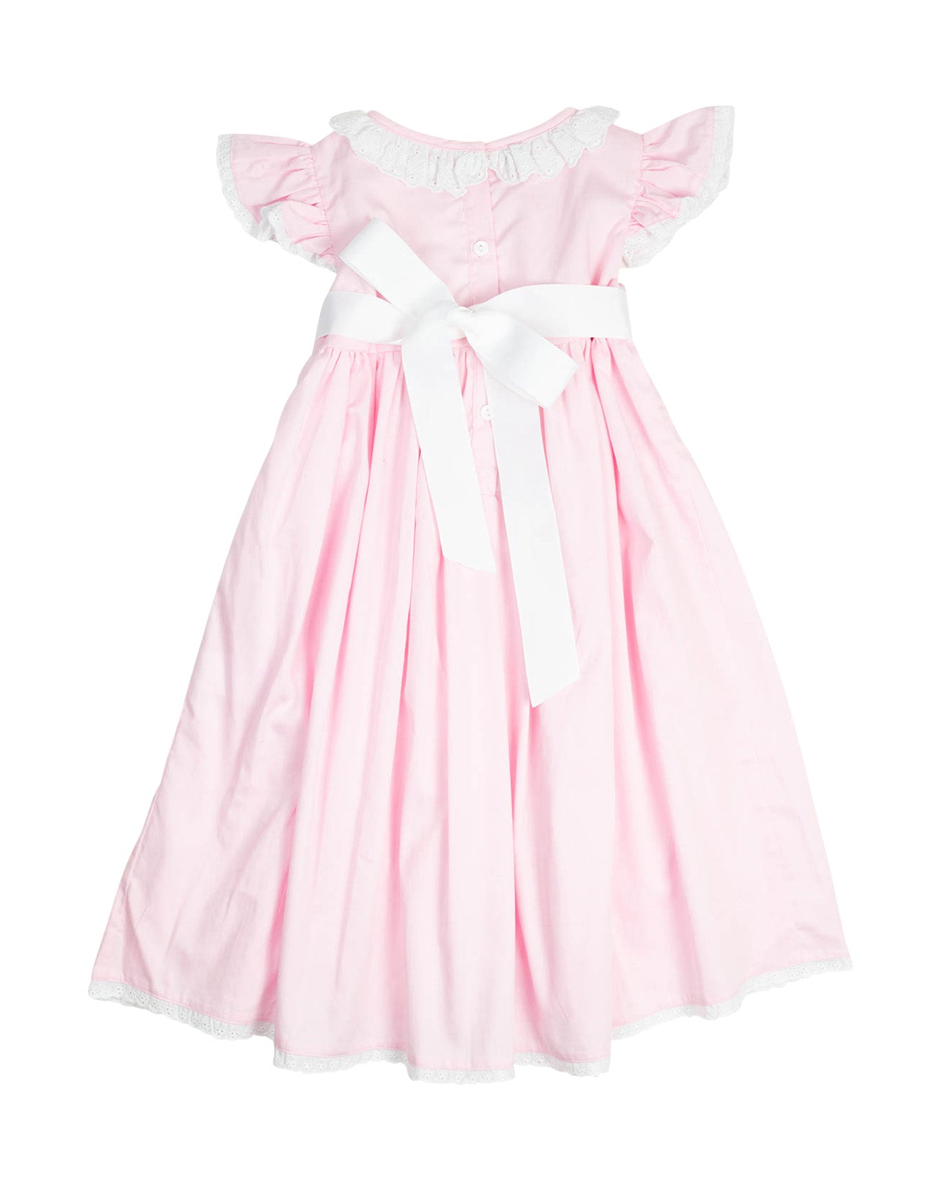 Timeless style for Easter or Spring! Pink ruffle sleeve dress with smocking detail on chest with vintage lace trim along sleeve and hem. You will love the sweet bow that ties in back. It's perfect for Easter!