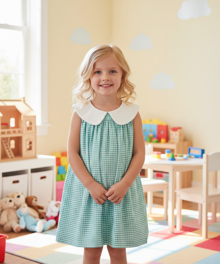 This white long sleeve blouse is a perfect compliment with anything. Not only does it have a green trim, but also has a ruffle collar. Bubble sold separately.