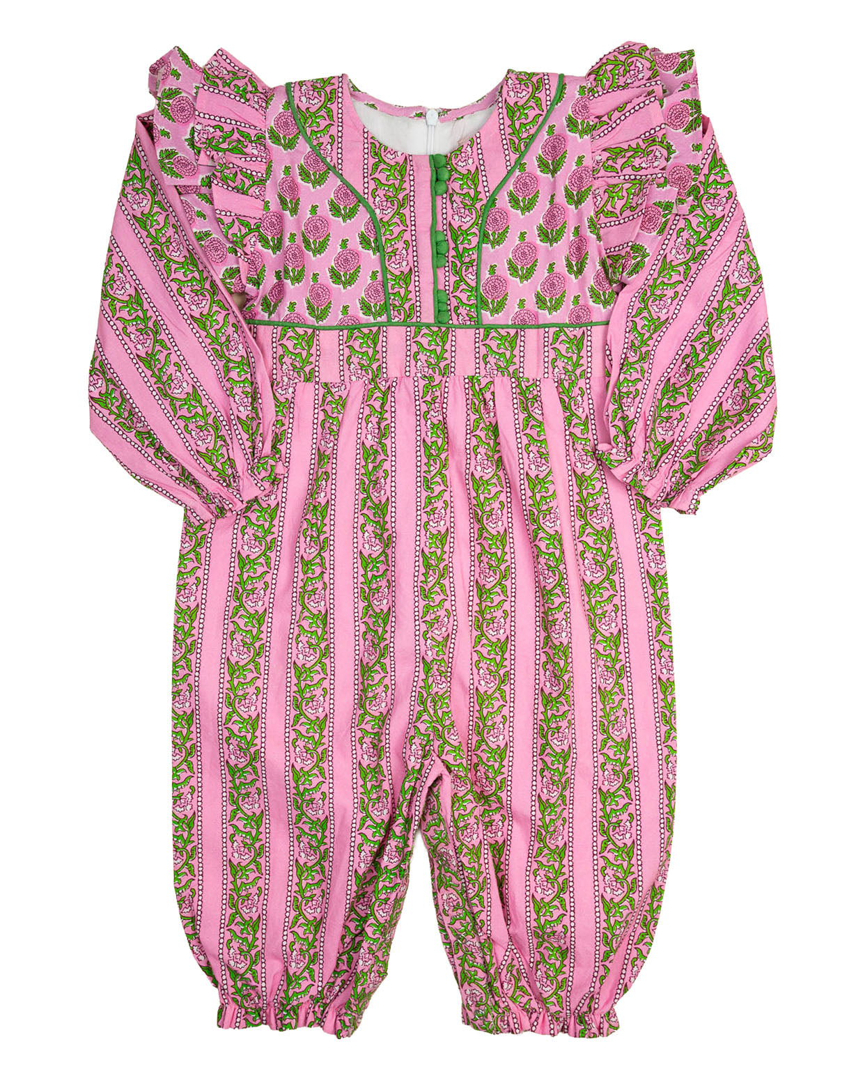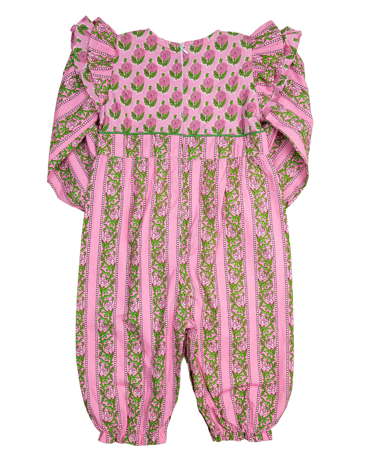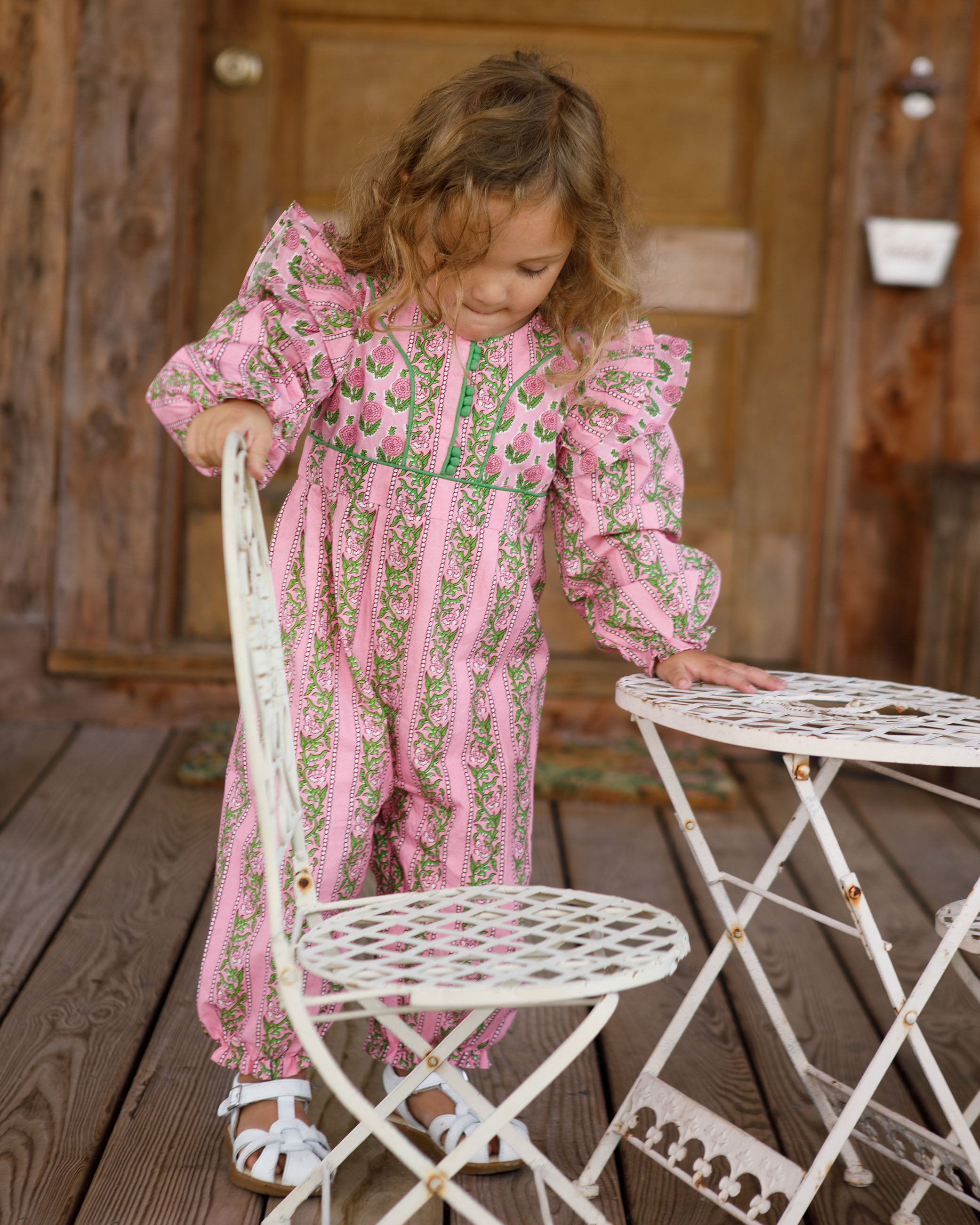 Pretty in pink and perfect for fall, our Pink Floral Mixed Block Print Romper is hand block printed in Jaipur on soft and breathable 100% poplin cotton. The mixed floral patterns add a playful twist, while sweet ruffles make it extra darling. Lightweight enough for warm afternoons, and easy to layer on cooler days—this romper is a must-have for your little one’s fall wardrobe.