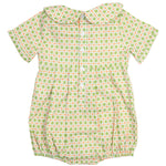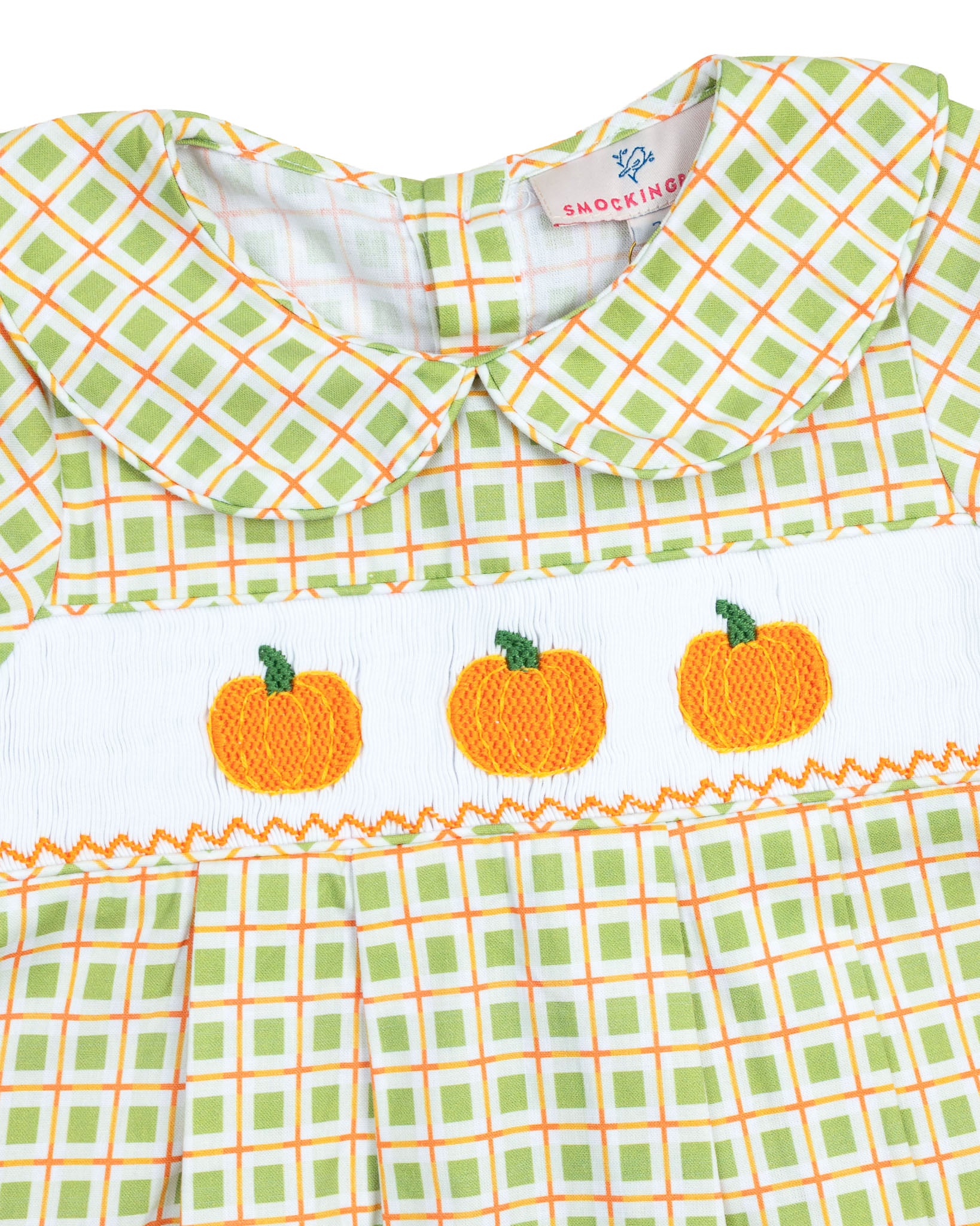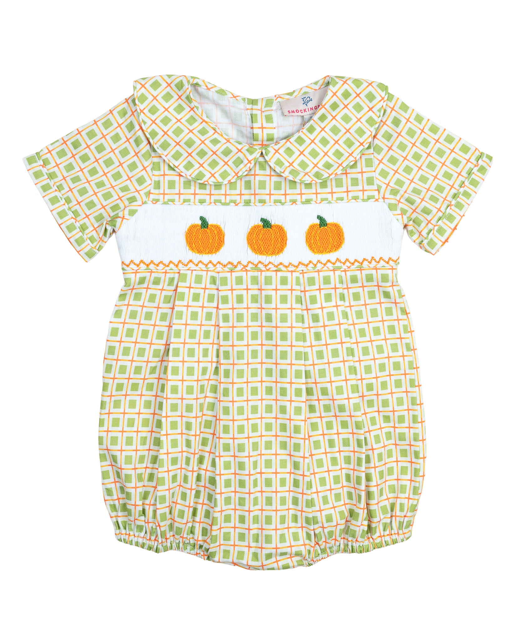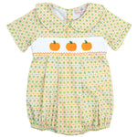 Match the season with this classic! The Pumpkin Smocked Plaid Boy Bubble features hand-smocked pumpkins, a Peter Pan collar, and short sleeves—designed for both comfort and cuteness. Ideal for Thanksgiving gatherings and cool autumn strolls.