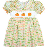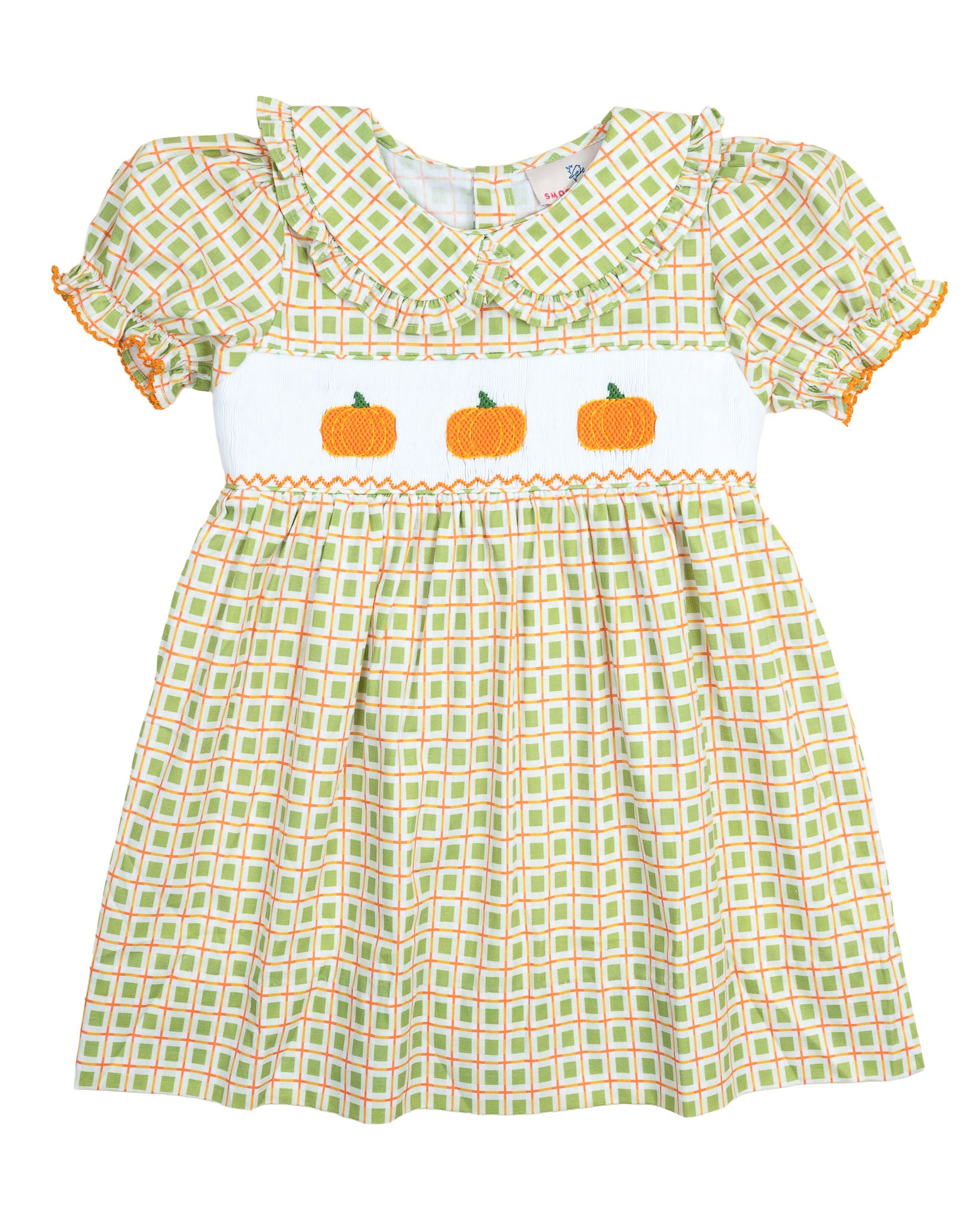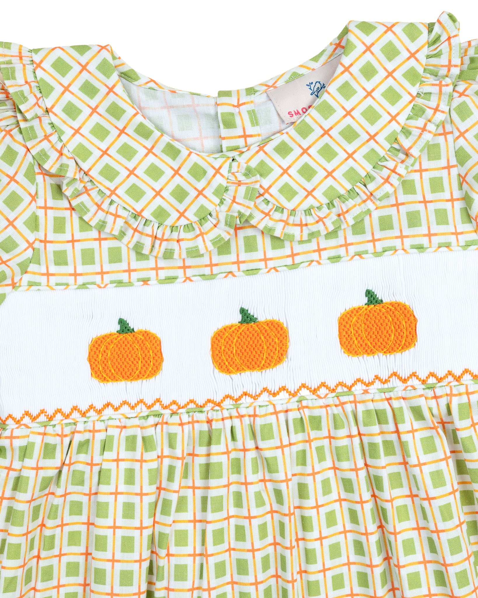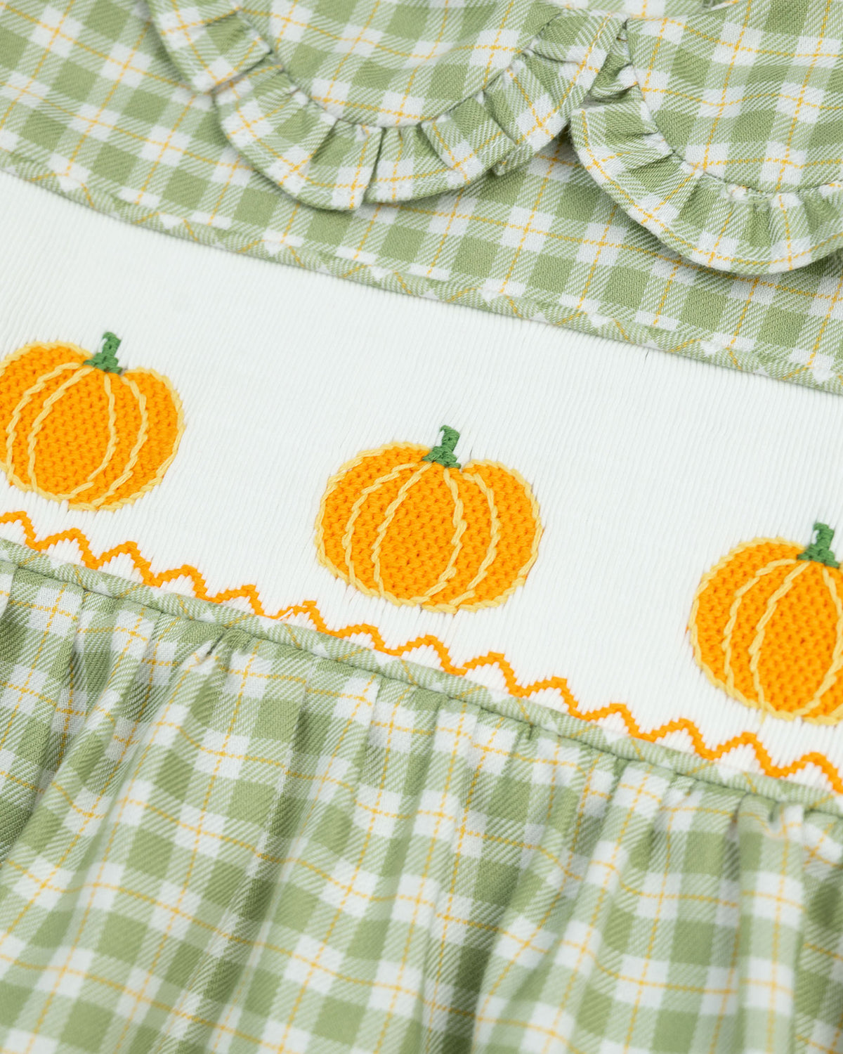 Celebrate the cozy season in our Pumpkin Smocked Plaid Dress! Made from soft cotton in a classic green plaid, this darling dress features hand-smocked pumpkins across the chest and sweet puff sleeves. Perfect for family photos, school parties, or pumpkin patch visits!