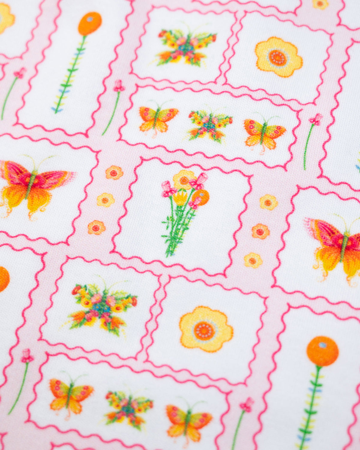 Dream in color with our Butterfly Garden Pajama Set, a delightful sleepwear option for your little one. Adorned with a playful butterfly print, this two-piece set combines style and comfort. The fitted top features a charming button up neckline, while the coordinating pants boast an elastic waistband for a snug yet flexible fit. Crafted from soft, breathable fabric, this set is perfect for cozy nights and lazy mornings. Pair it with our daytime Butterfly Garden Smocked Dress or Bubble for a wardrobe that transitions seamlessly from dreams to play!