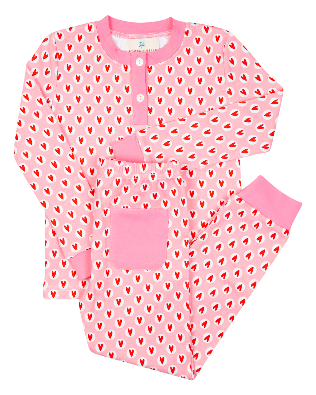 We ❤️ this Valentine Hearts Knit Pajama Set! We love the soft knit and pink polka dot heart pattern throughout. They are perfect for for a mother daughter Valentine matching set. These pajamas feature long sleeves and long pants with pink trim around the neck, wrists, and ankles. These soft knit pajamas are snuf fit and are not sprayed with any chemicals. 95% cotton, 5% spandex.