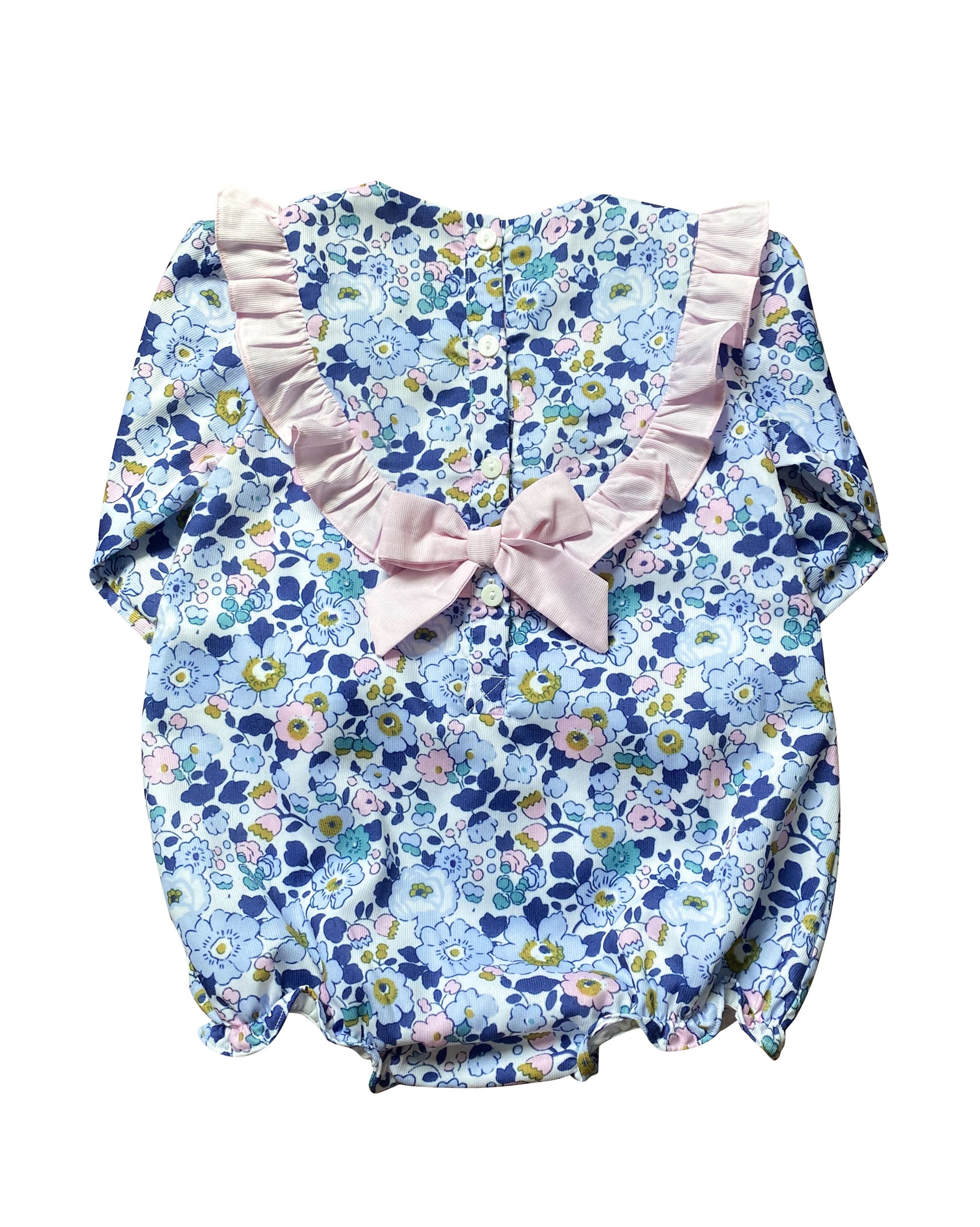 From her head to her toes she will look adorable in this blue floral bubble with a pink bow in back . This classic silhouette comes with a ruffle collar, long bishop sleeves with elastic in hem, and ruffles— Bubble comes with metal snaps in stride with ruffles on each leg hole.
