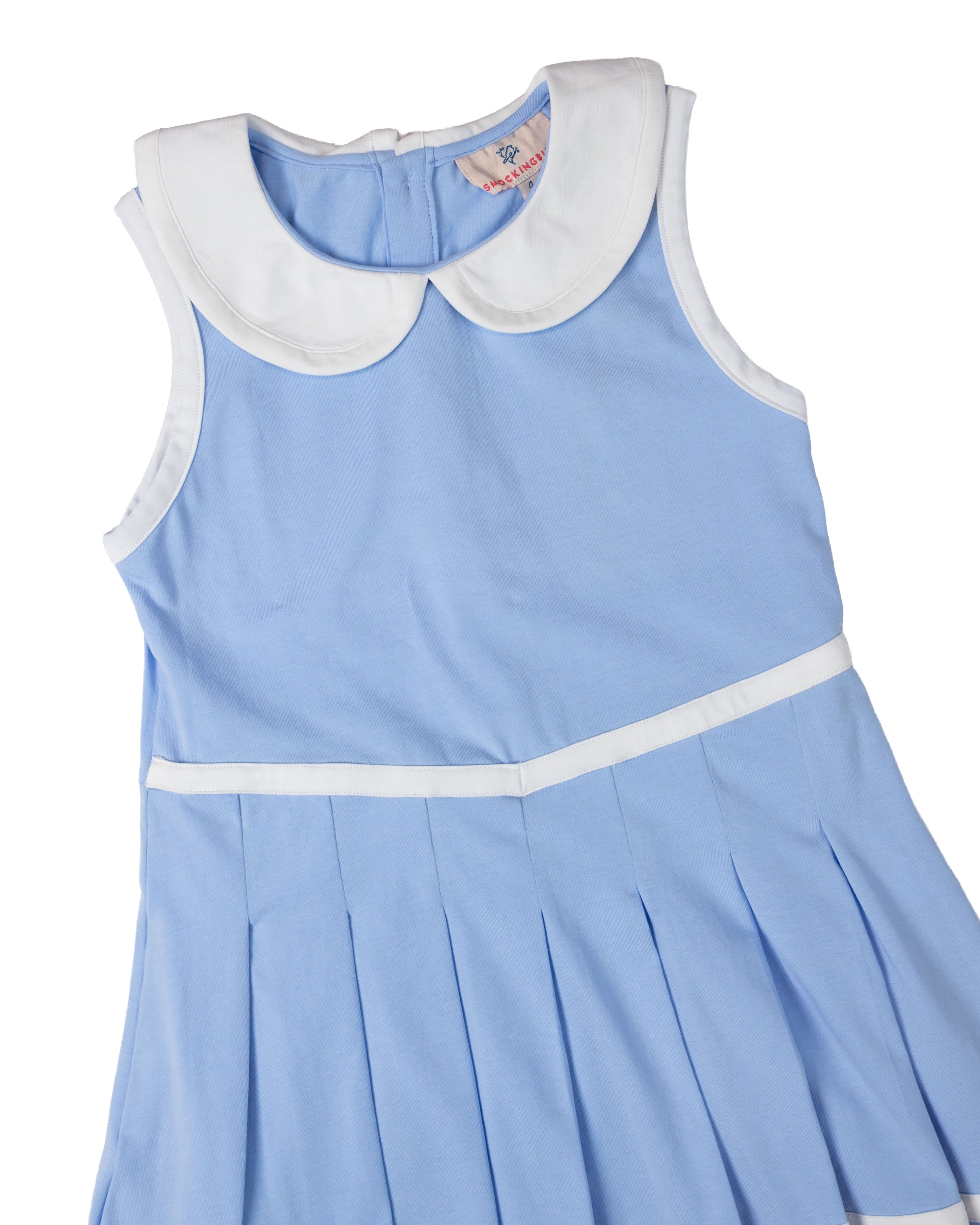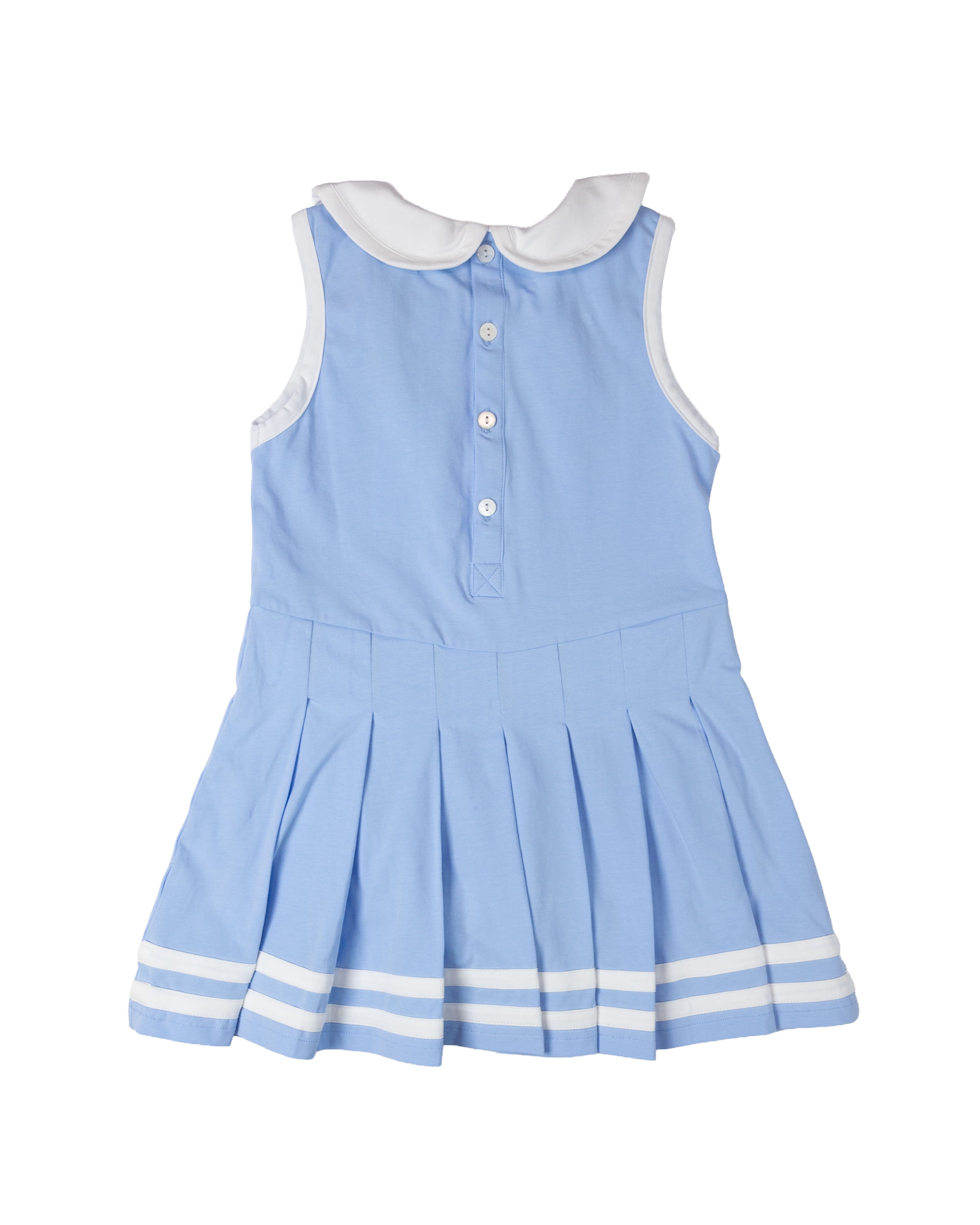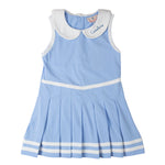 Elevate your game of tennis in this Light Blue Knit Tennis Dress. Dress features white trim along the sleeves, collar, and a pleated hem. Add a name or monogram to this dress for a personal touch.