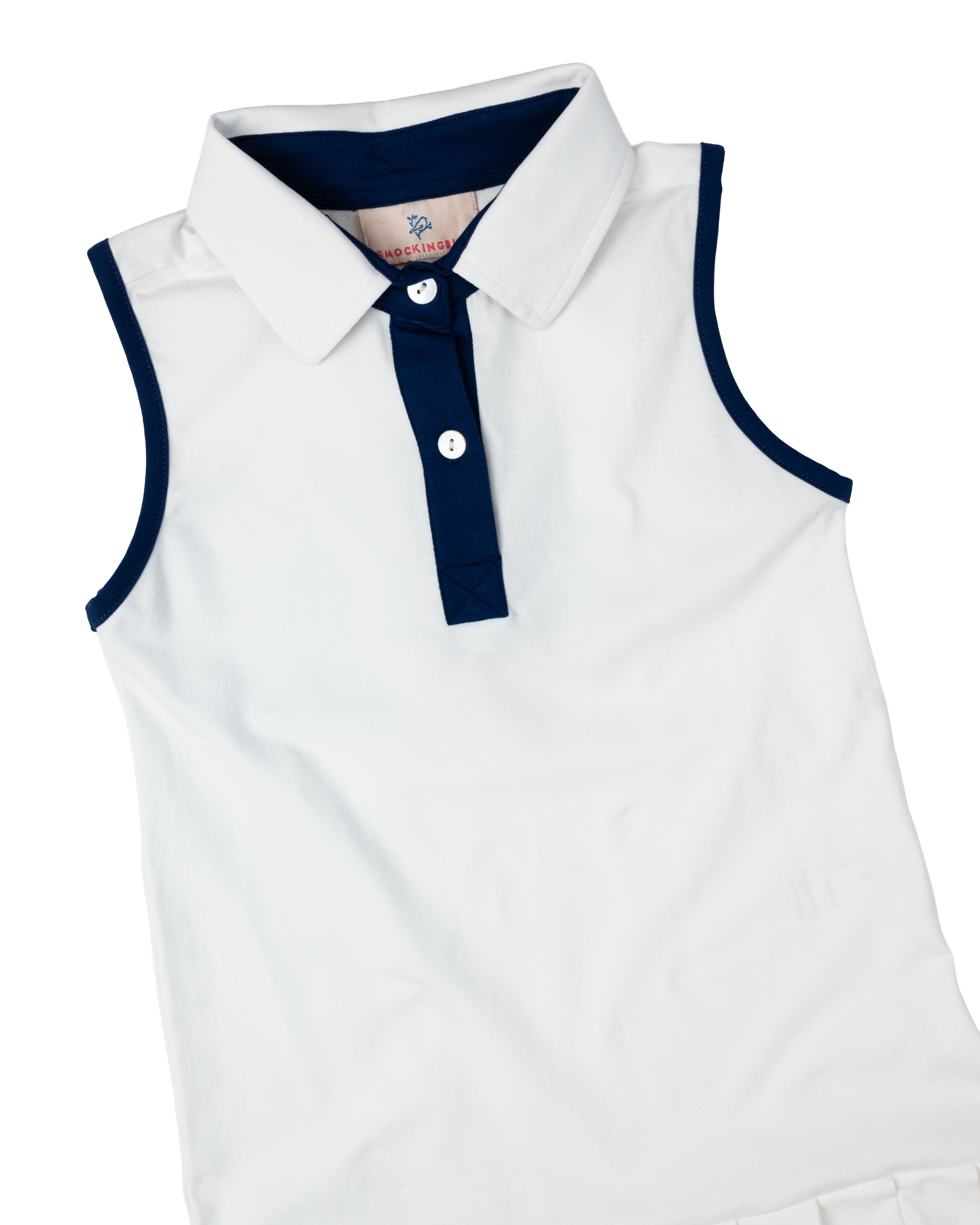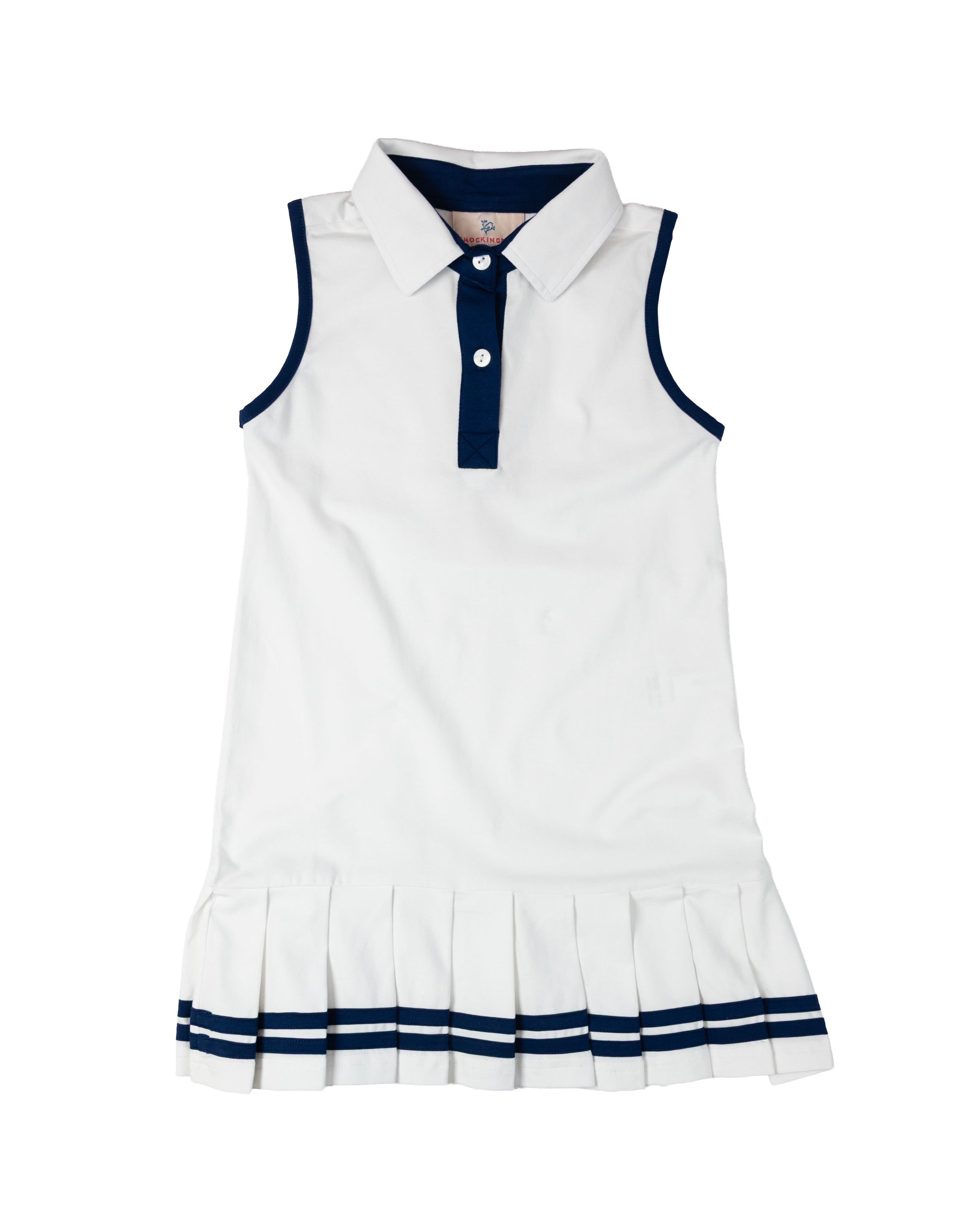 Elevate your game of tennis in this White Knit Tennis Dress with Navy Trim. Dress features navy trim along the sleeves, collar, and a pleated hem. Add a name or monogram to this dress for a personal touch.