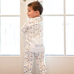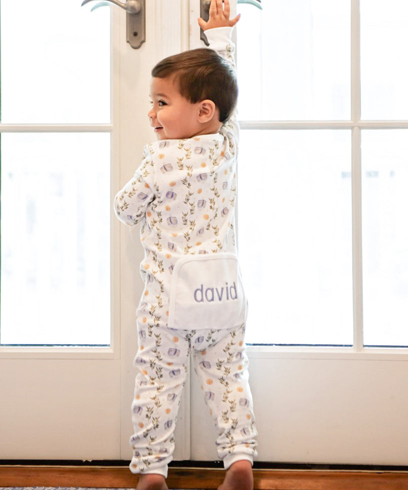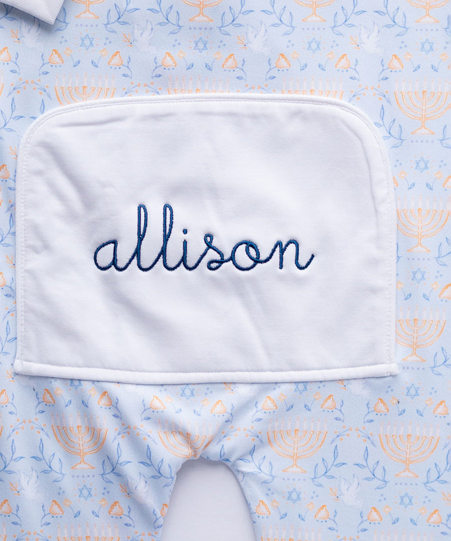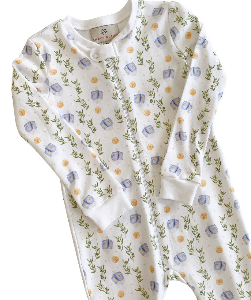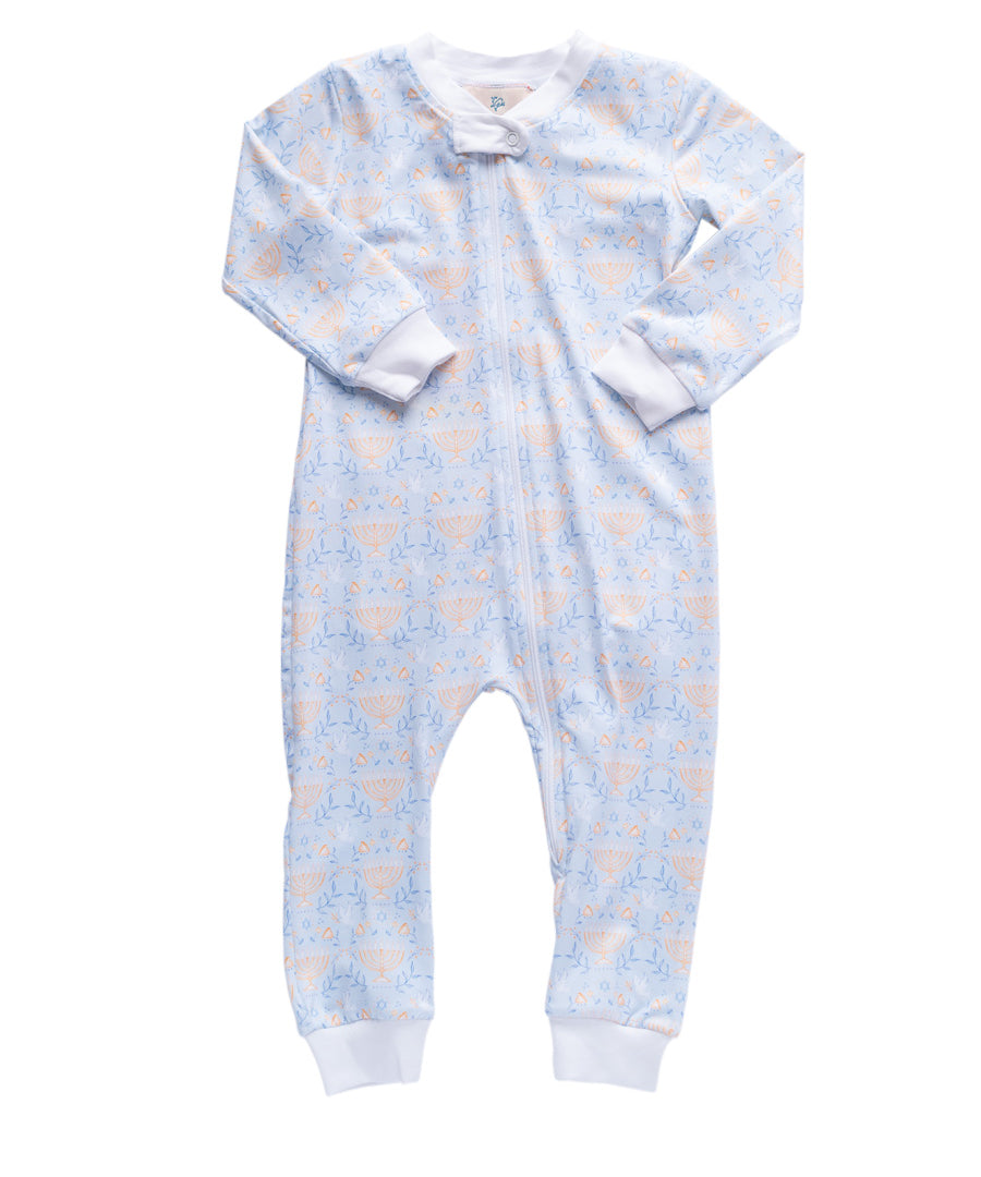 Our New Hanukkah pima cotton pajamas come in a sweet dreaming of dreidels print. The softest pajamas for the light of your world come in a set or zip up. Add a monogram in a blue thread for a personalized touch.