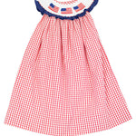 Flags Smocked Red Windowpane Dress features smocked American flags across the neck, navy ruffle, and buttons down the back. This festive dress is perfect for celebrating Memorial Day or the 4th of July. Bishop length on our size chart. Add a monogram on the hem for a personal touch.