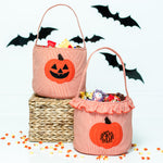 Our Jack O'Lantern Applique Trick or Treat Bag is a must-have for Halloween. Featuring a pumpkin on one side and a jack o' lantern on the other, this bag adds festive flair to your Halloween celebrations. The monogram is shown in a black circle font, and the bag measures approximately 12x9 inches, making it perfect for collecting treats and enjoying Halloween fun.