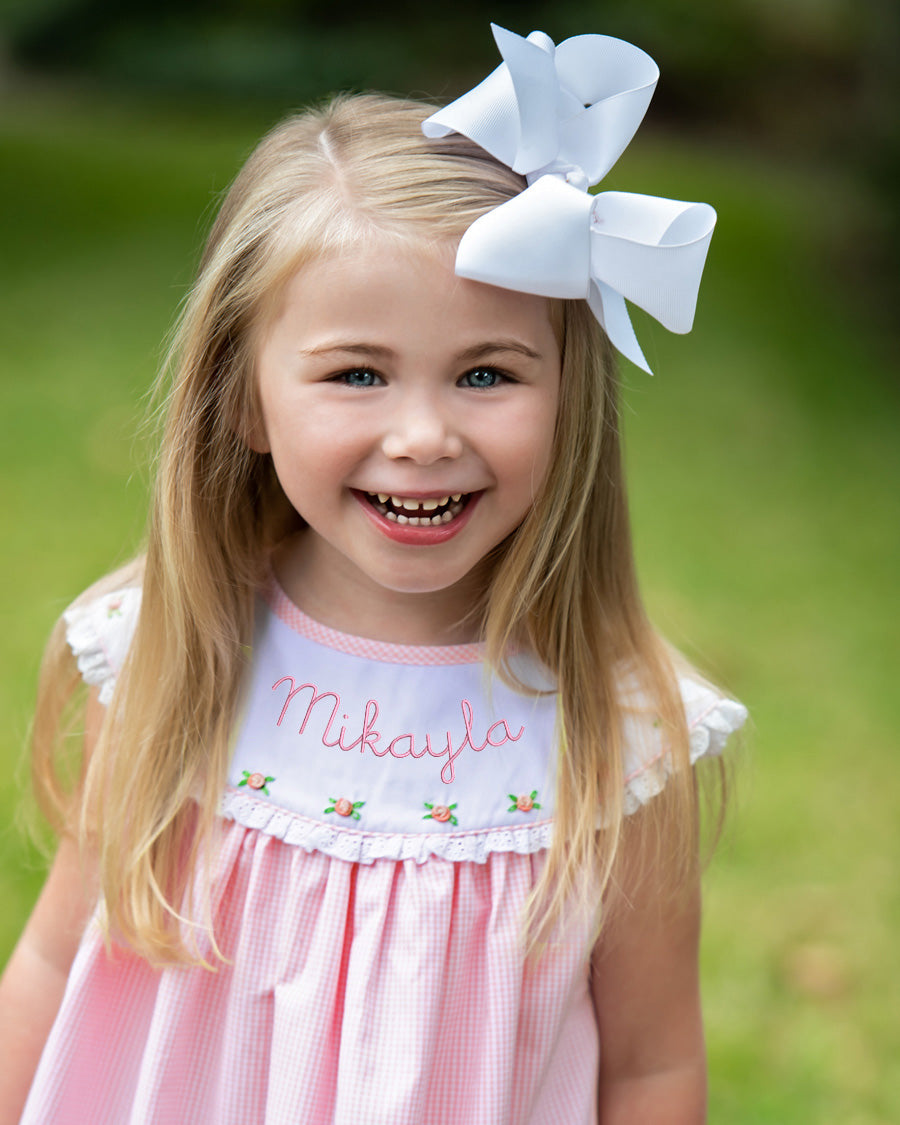 This precious dress is the perfect outfit for any occasion. Using Pink gingham and a large round White collar trimmed with hand embroidered rosettes your little one will be the center of attention. Add a hair bow for the finishing touch!