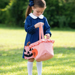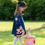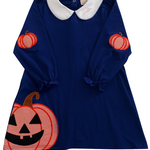 Pumpkin carving becomes extra festive with our Jack O' Lantern Applique Navy Knit Dress. Perfect for Halloween, this navy knit dress features a playful pumpkin applique and a Peter Pan collar. Available in matching sibling sets and a coordinating trick-or-treat basket, it’s ideal for celebrating the spooky season. Personalize the dress with a monogram on the center chest or a name on the collar for a special touch.