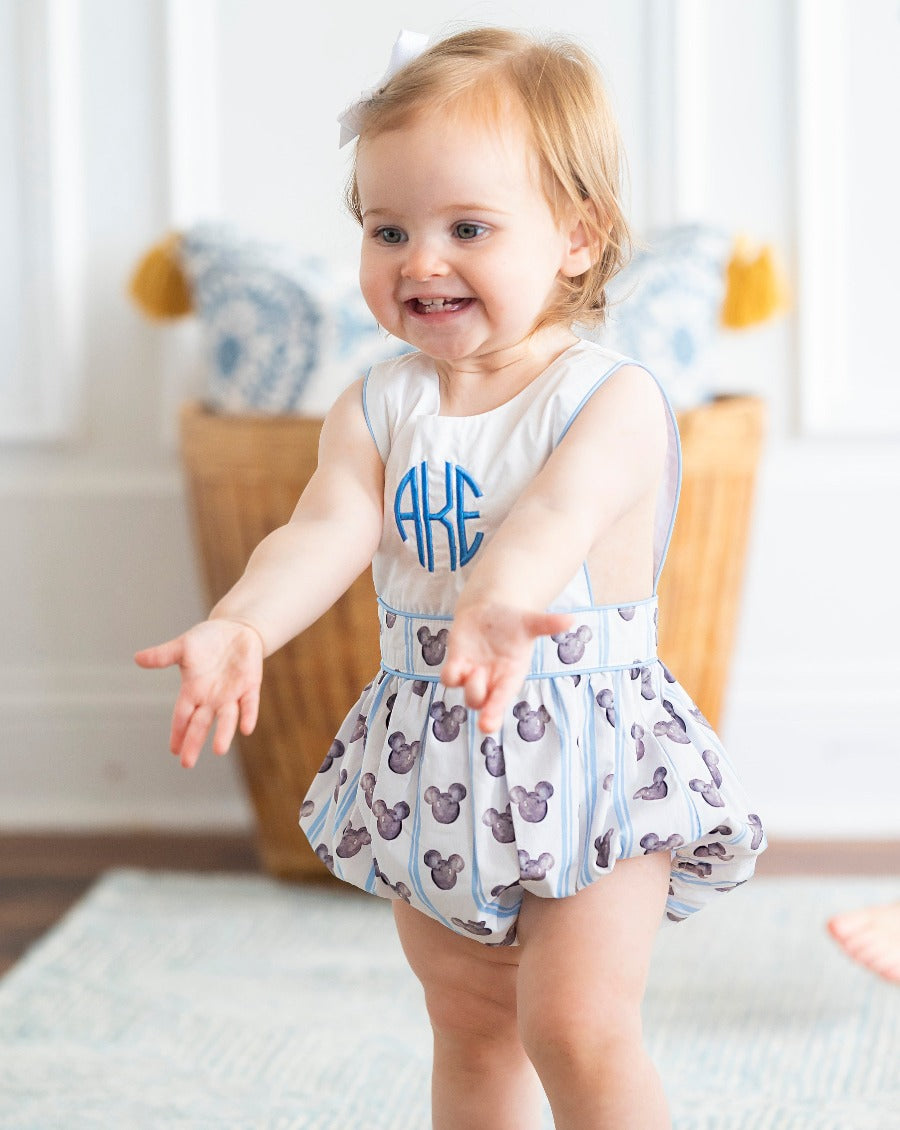 Memories are sure to be made in this darling Hand Painted Mouse Print with Blue Stripes bubble. Perfect for the parks, this bubble is lightweight with snaps in the stride for easy changing. Add a personal touch with a monogram to the center chest. 100% cotton